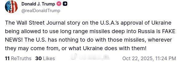 特朗普发帖否认了WSJ关于他同意给乌克兰长程导弹以袭击俄罗斯领土的报道,称这是假新闻。