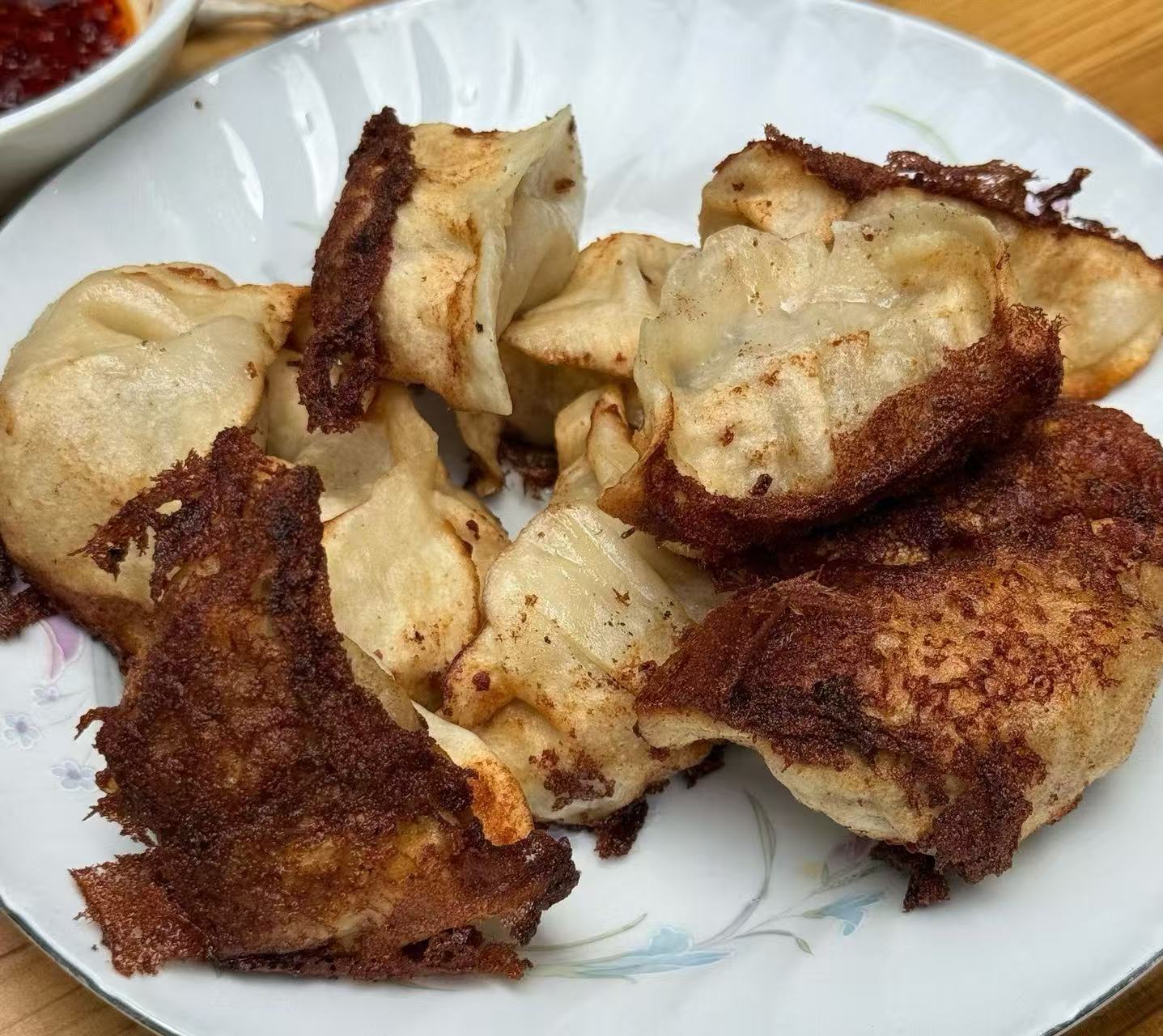 2️⃣.香菇煎饺,外皮金黄酥脆,咬开爆汁,肉馅饱满咸香。