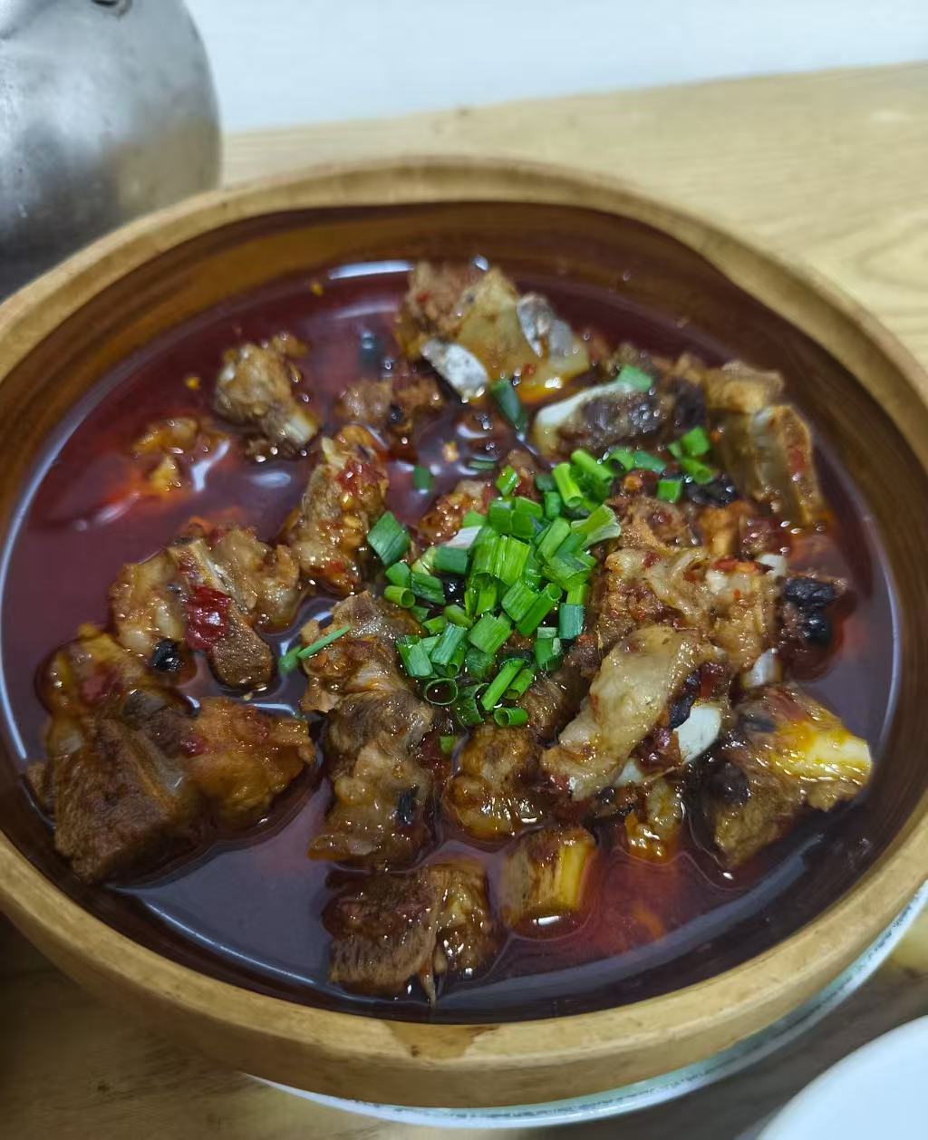 4️⃣.砂锅排骨,猪排骨和干辣椒粉,豆豉直接蒸,吃起来香辣浓郁。