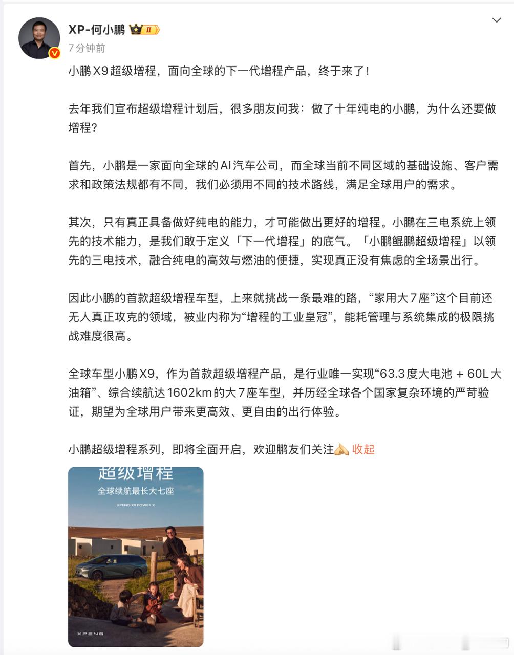 1602公里续航的小鹏X9超级增程来了科技豪华再进阶。更多的消息来了: