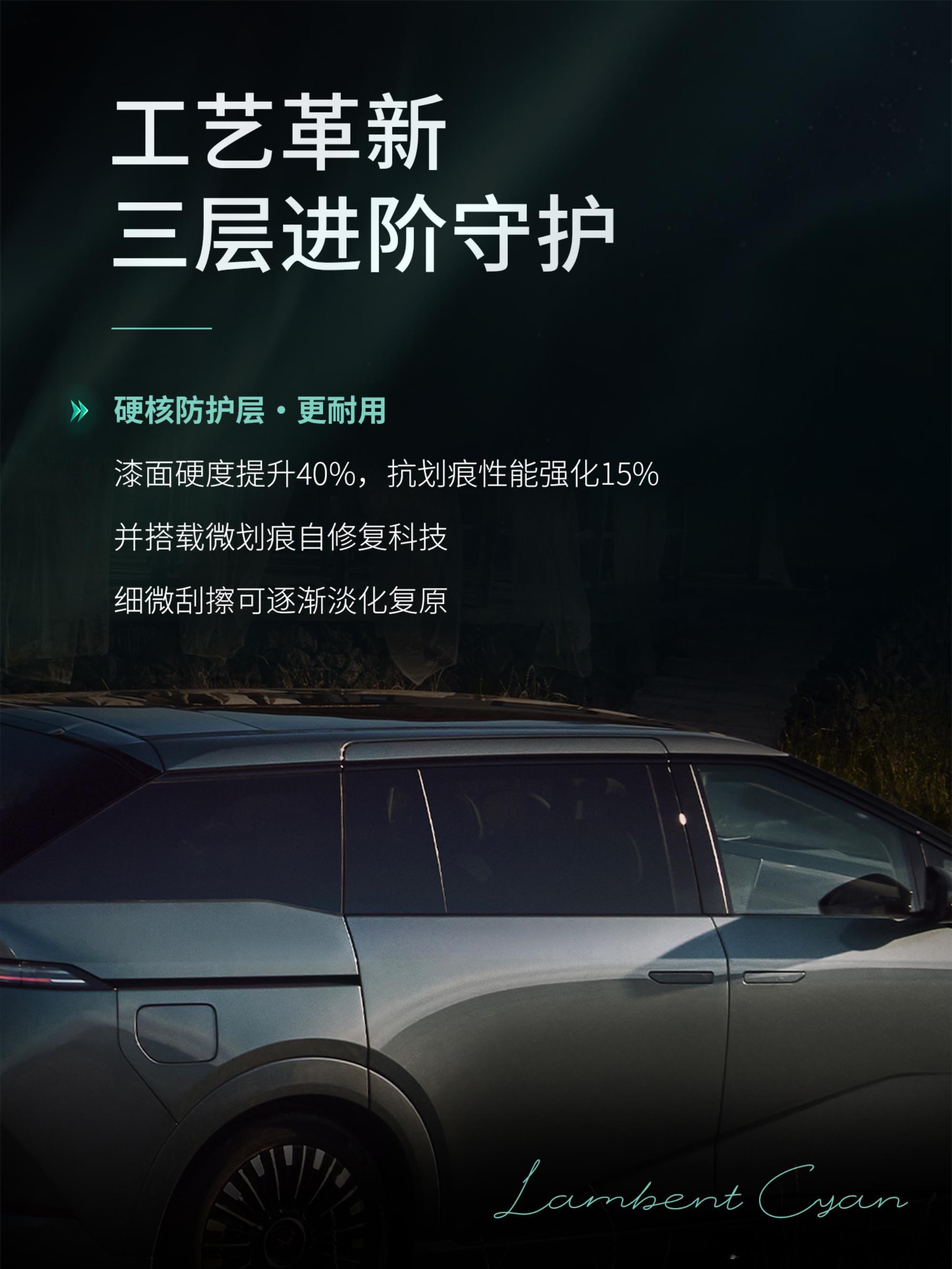 新颜色——极光青,采用巴斯夫ProGloss PLUS 2K高透清漆,百万豪车标配。漆膜厚度较行业平均水平提升20%,立体通透。漆面硬度提升40%,细微刮擦可淡化复原,车色历久弥新。