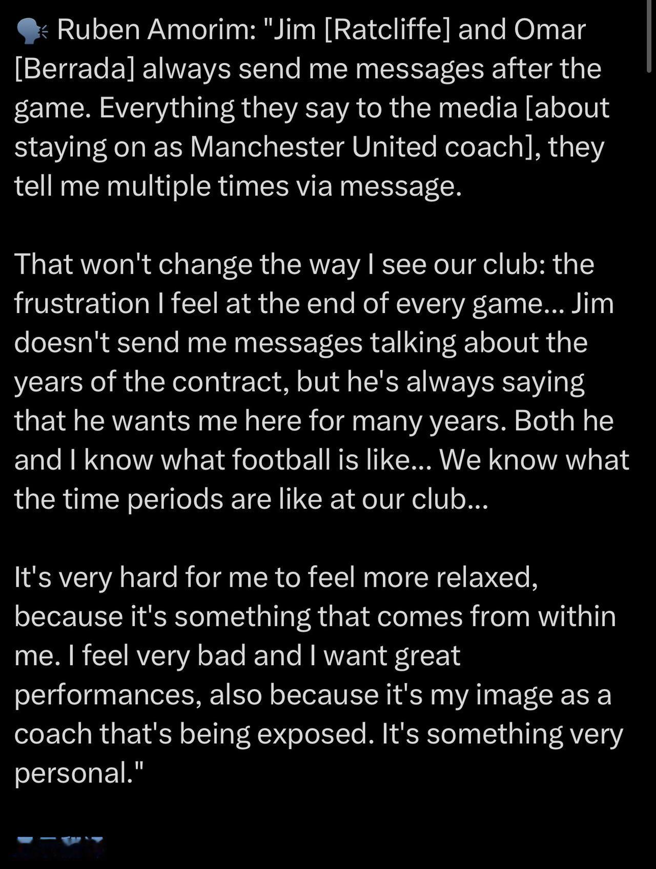 管理层重来没有给我压力,压力和愤怒都是我自己的感受和要求! 🔴阿莫林:“吉姆(拉特克利夫)和奥马尔(贝拉达)总是在赛后给我发信息。他们对媒体说的每一句话(关于继续担任曼联主教练),他们都通过信息告诉我好几次。” 🔴这不会改变我对我们俱乐部的看法:每场比赛结束后我都会感到沮丧……吉姆不会给我发信息谈论合同的年限,但他总是说他希望我在这里效力很多年。他和我都知道足球是什么样的……我们知道我们俱乐部的时代是什么样的…… 🔴我很难放松下来,因为这是发自内心的感受。我感觉很糟糕,我想要有出色的表现,也因为我作为教练的形象受到了损害。这是一件非常私人的事情。