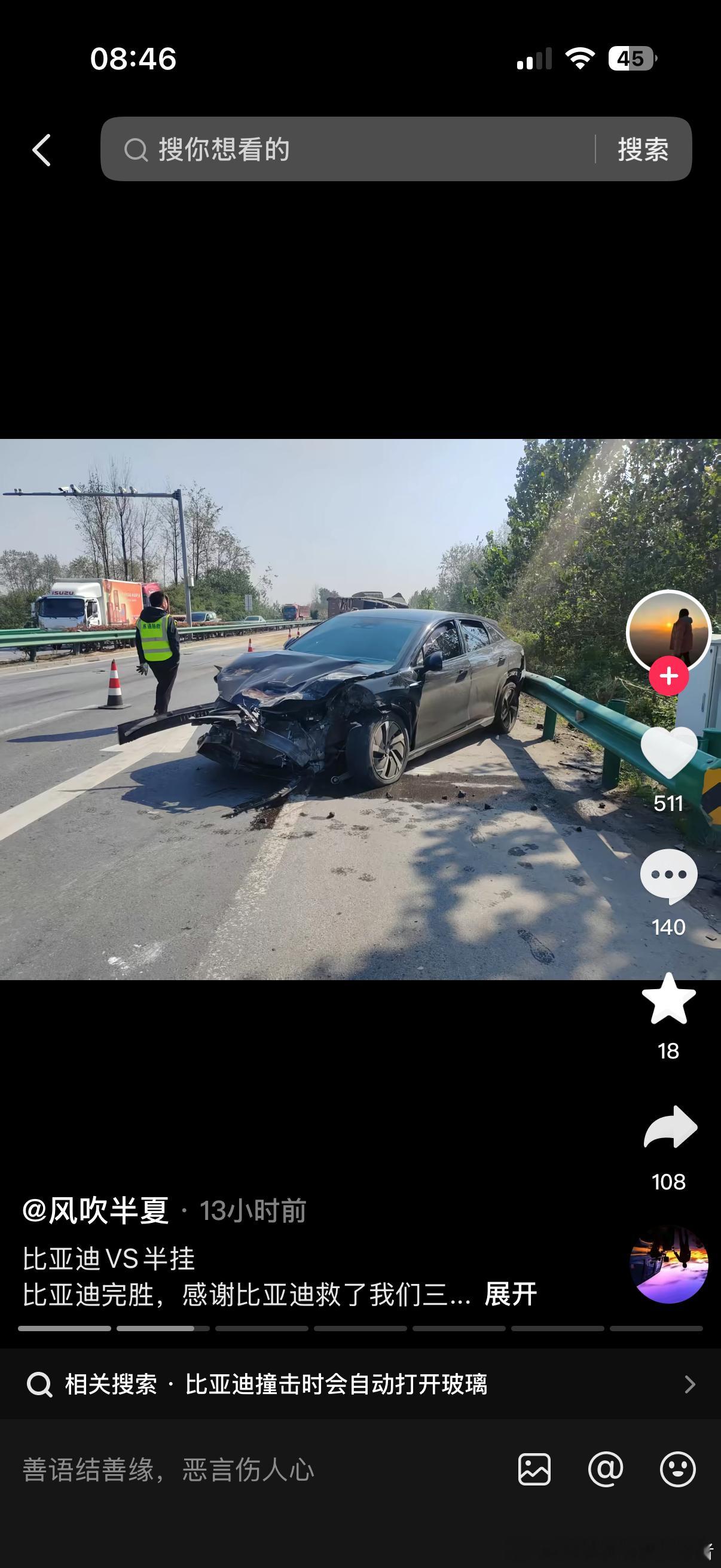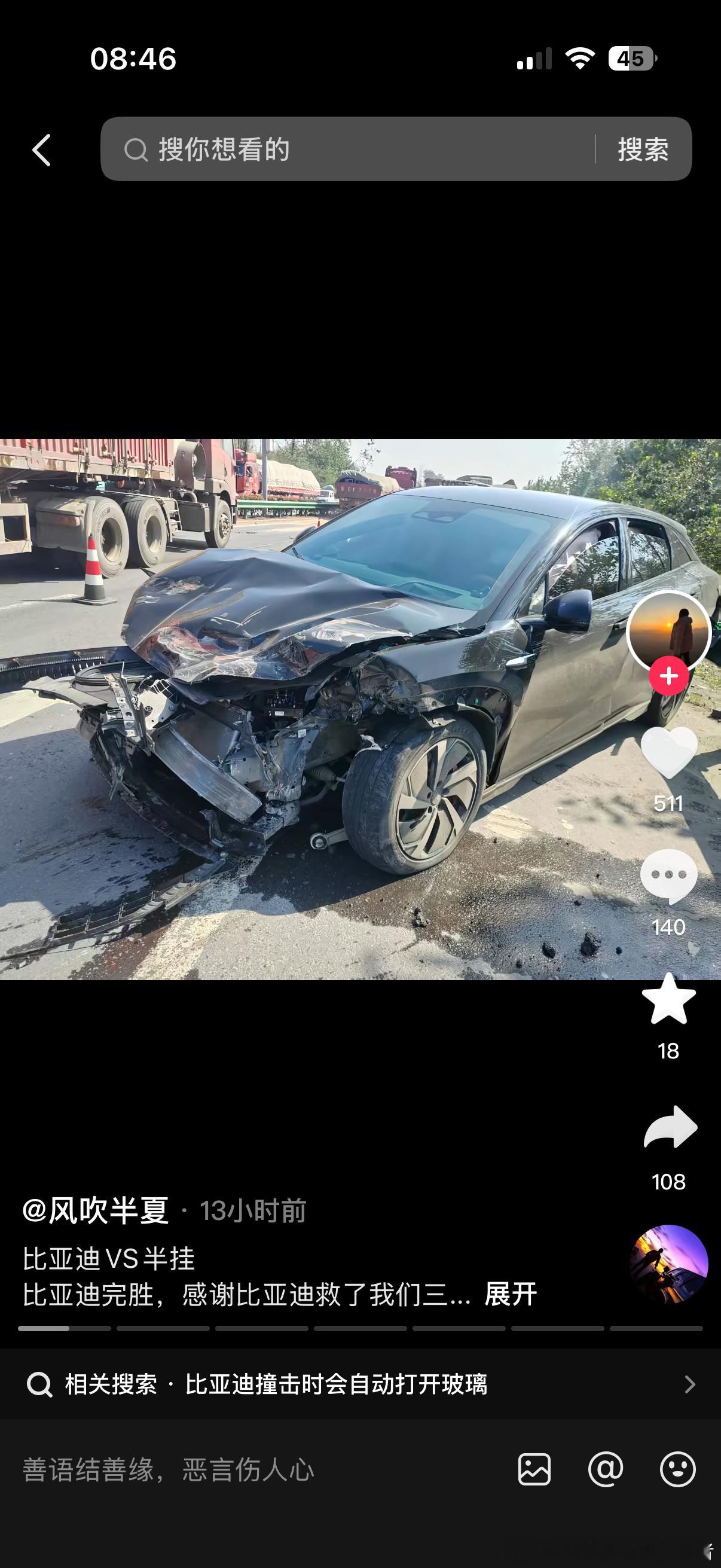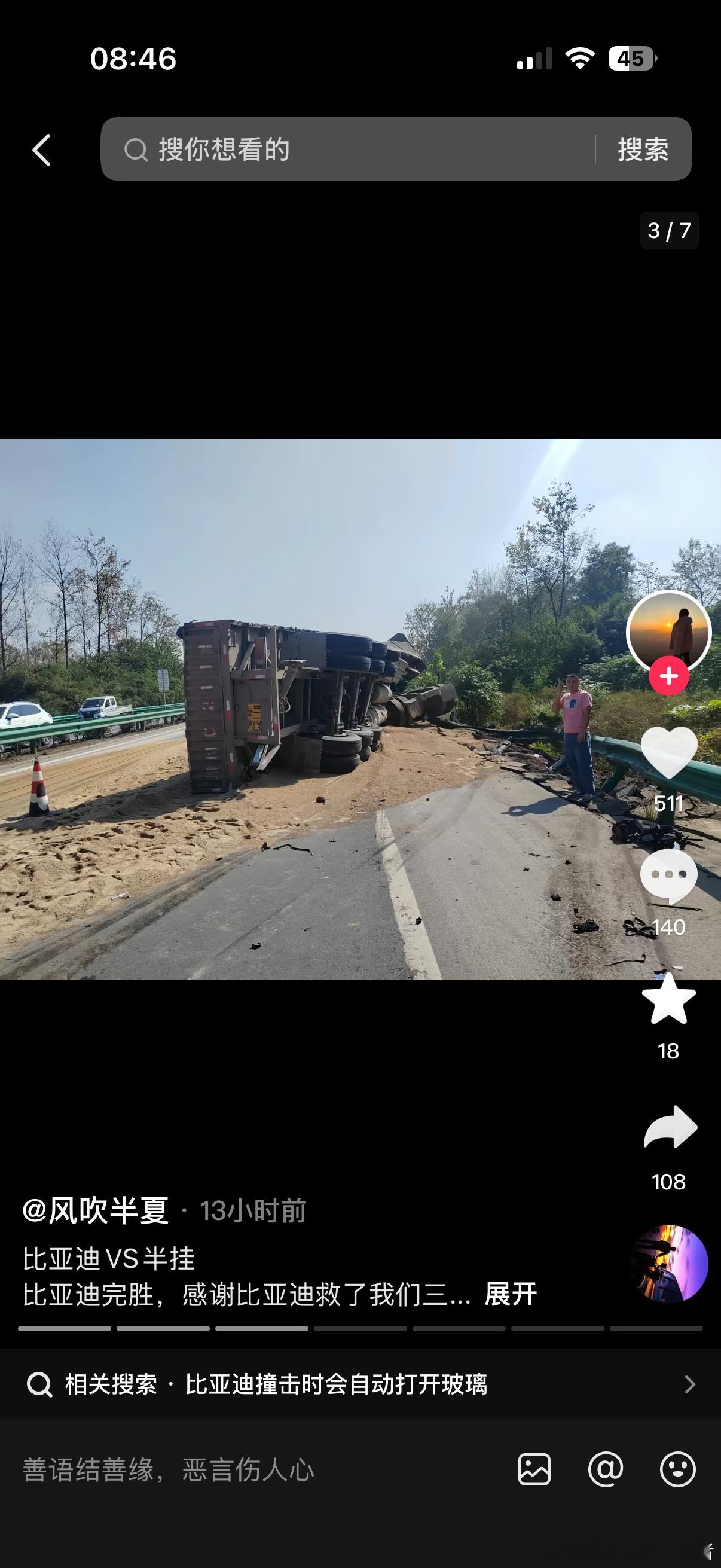 一辆比亚迪海狮07 EV和半挂车发生碰撞,挂车发生侧翻,海狮07EV车头受到损害,但车内人员仅受轻伤。车辆发生碰撞时,安全气囊打开保护人员安全,车窗自动下降,车辆自动报警,刀片电池安全性也很强。