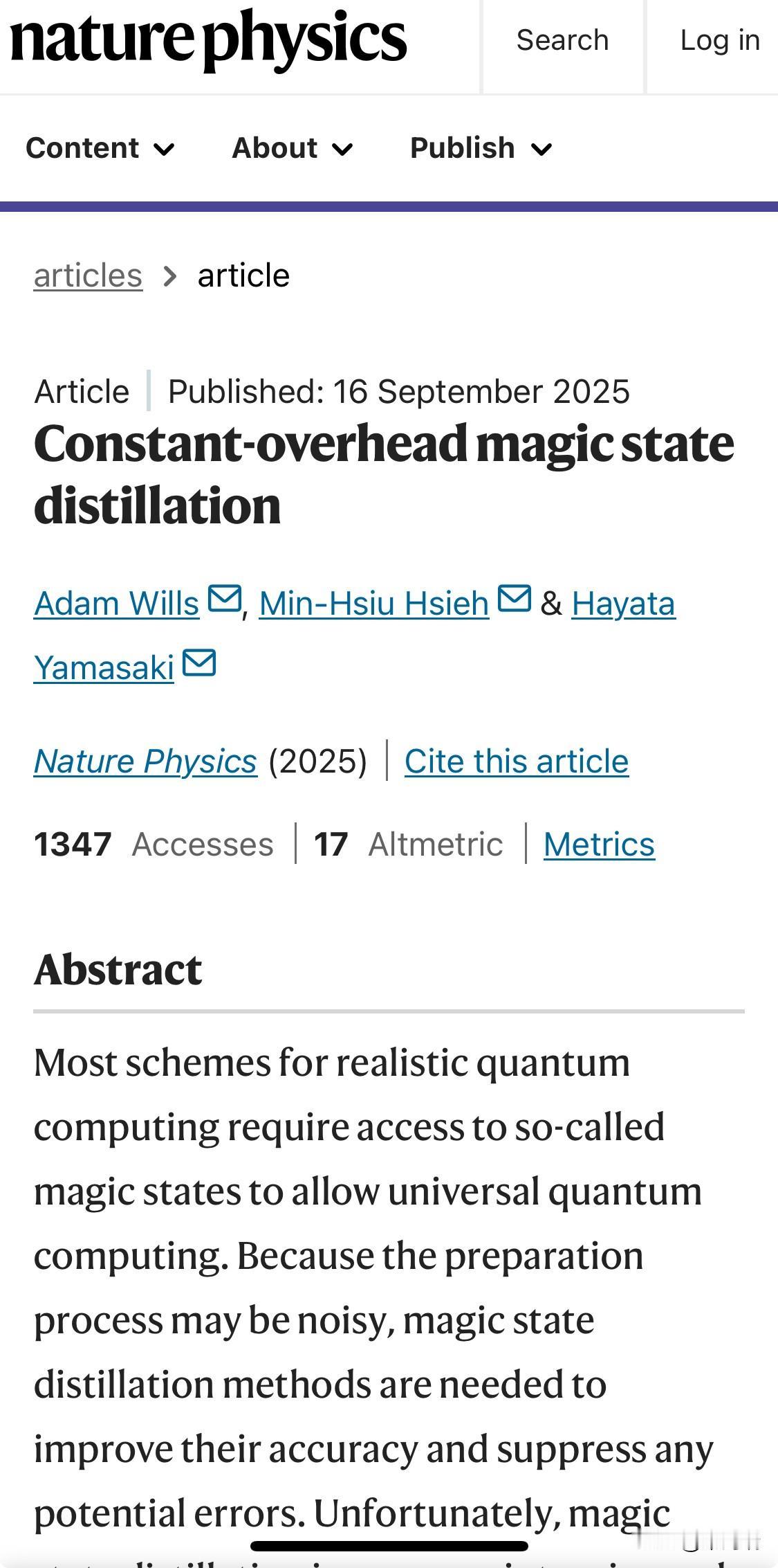 鸿海旗下研究院在量子运算领域又有新突破!近日发表的论文《Constant-Overhead Magic State Distillation》登上了全球最具影响力的科学期刊之一《自然-物理学(Nature Physics)》,显示研究成果已获得国际学界高度肯定,并具有极高的学术与技术影响力。 由鸿海研究院量子计算研究所所长谢明修、麻省理工学院(MIT)研究员亚当.威尔斯(Adam Wills)与东京大学教授山崎隼汰(Hayata Yamasaki)共同完成。团队在「魔术态净化(Magic State Distillation, MSD)」技术上取得重大突破,成功开发出一种「常数开销(constant-overhead)」的新方法。简单来说,这项技术能在进行量子运算时,让资源的使用量保持稳定,不会因为目标错误率提升就必须耗费更多资源。这解决了长久以来量子运算在精度与效率之间难以兼顾的难题。 研究团队运用高效的「量子错误更正码」技术,搭配「Clifford逻辑闸」与快速转换机制,成功让T逻辑闸与CCZ 逻辑闸只需固定数量的输入魔术态。这不仅大幅提升大规模量子计算的可行性与效率,也在理论上达成了目前MSD技术的最佳效率,为量子错误更正资源优化开启全新里程碑。