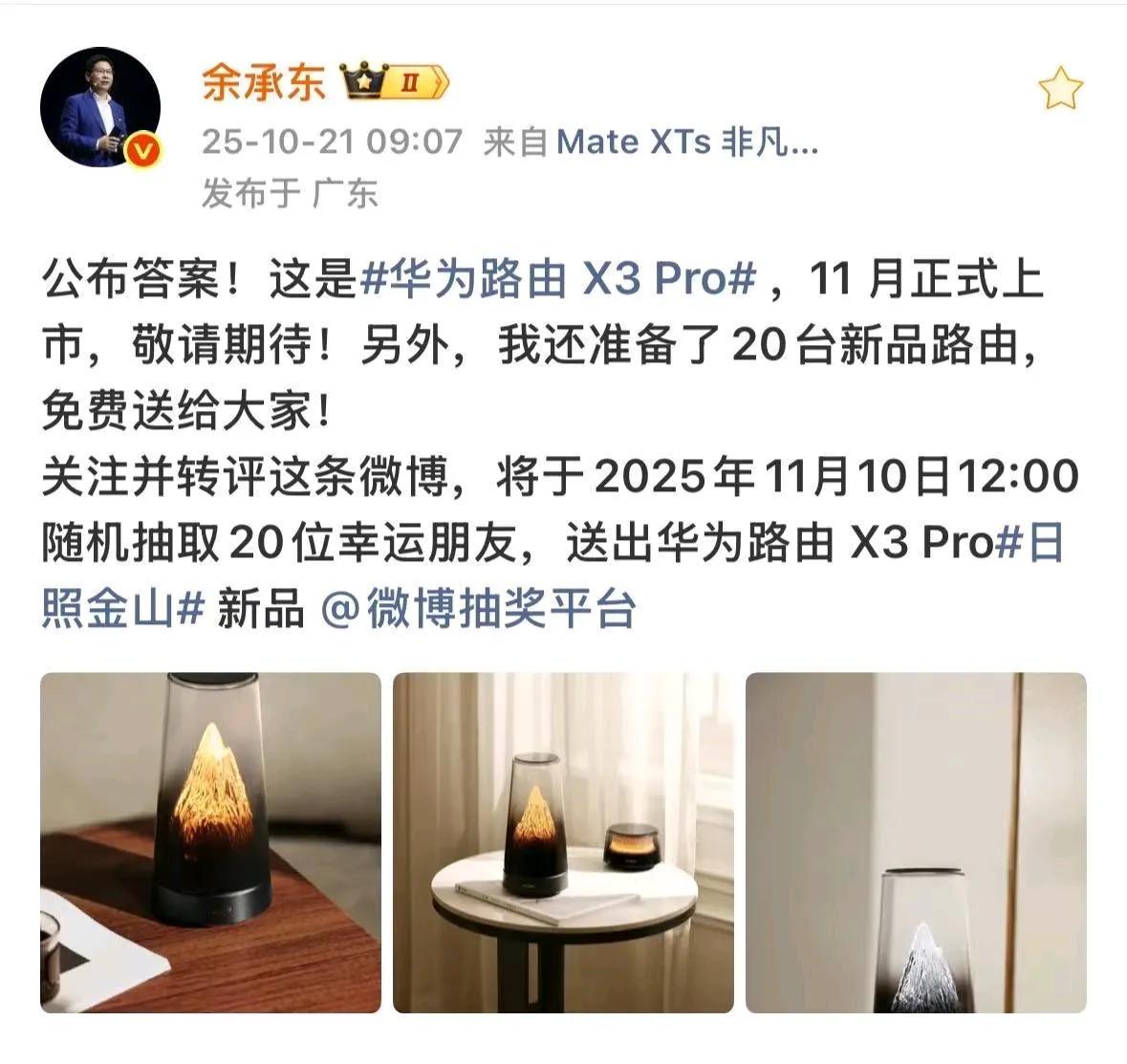 还是华为设计师的脑洞大,华为路由新品正式公布,在家也能看“日照金山”了。 前几天余总发布了一张“日照金山”的新品图,还让大家猜猜这是什么,直接引起网友们的广泛讨论,甚至还有人P图玩梗“余工移山”,太热闹太有趣了。就在21日,余总亲自为我们揭开了谜底,没想到这个艺术气息拉满的的新品居然是路由器。 日照金山形态的路由器,这样的创新设计我是真没想到,真的想夸赞一下华为设计师脑洞是真的大,把之前因为丑只能放在角落的路由器做成了艺术品,照这样的演变下去,未来华为路由器形态该不会演变成花瓶、手办之类的吧?有点期待了。余承东官宣华为新款路由X3 Pro