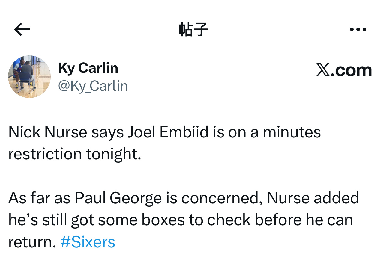 主教练尼克·纳斯在采访时表示,乔尔·恩比德今天比赛是有上场时间限制的。