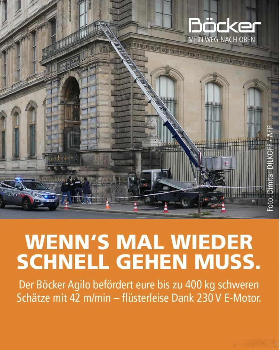 德国两口子在北威州经营家具升降机公司,周日中午当他们坐在家里看新闻,简直不敢相信自己的眼睛。他们不仅是因为卢浮宫失窃案而震惊,更让他们难以置信的是,劫匪使用的正是他们的产品!