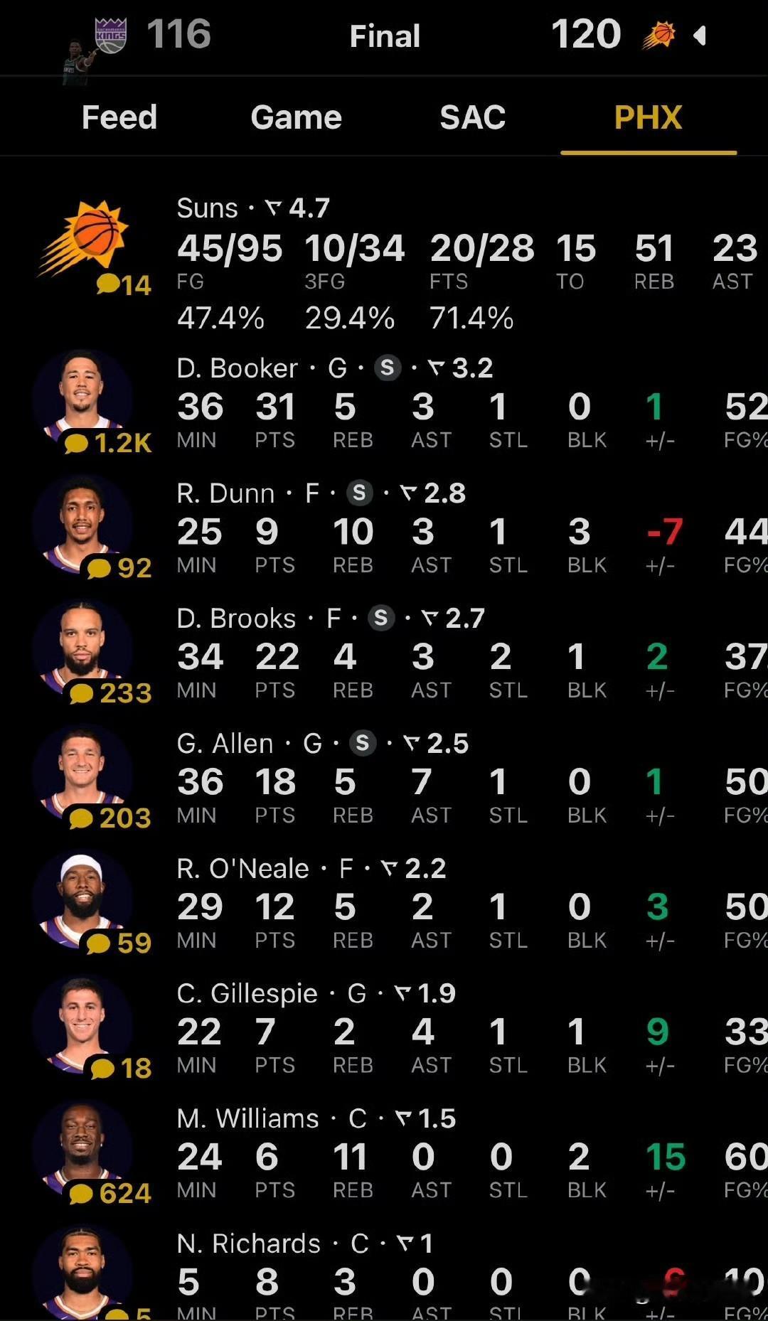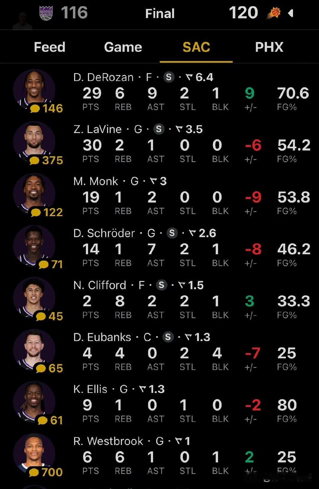 威少国王首秀6+6!!!布克31+5,引领20分大逆转带队拿下开门红! 这场比赛大家应该是没有预料到的吧,太阳的主场揭幕战,迎战的是没有萨博尼斯的国王,尽管国王双星拿下59分,但是太阳那边也能回应的上,最终太阳120-116逆转国王。 当小萨不在,这个时候拉文和德罗赞成了球队的大小王,这两人在一起就想起了当年的公牛,真的没看懂国王的建队,好好的一副牌打的细碎! 太阳这边布克火力给的可以,自己拿下31+5,而且关键时刻敢出手,狄龙也是很给力,这家伙有进攻有防守,球队需要这样的球员,很好用,最关键的是马威……6分11篮板2盖帽,这打的不错吧,湖人后悔没有。 没有杜兰特和比尔的太阳活了,他们取得开门红,这样打下去晋级季后赛也是没有可能的,加油。 威少
