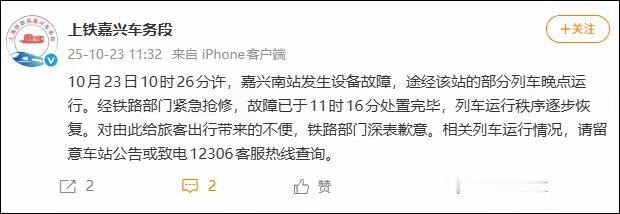 10月23日网友反映杭州东站列车大面积延误,北上高铁堵在嘉兴南站。随后上铁嘉兴车务段通报,10时26分许嘉兴南站设备故障,致使部分列车晚点。好在11时16分故障就处置完毕,列车秩序也逐步恢复,铁路部门还为此致歉,并提醒旅客留意车站公告或通过12306查询。 其实此前4月10日也有类似情况,湖州站接触网故障致宁杭高铁部分上行列车晚点,不过最终也抢修完毕恢复秩序。设备故障虽难预料,但希望铁路部门能进一步提升应急处理能力,减少对旅客出行的影响。