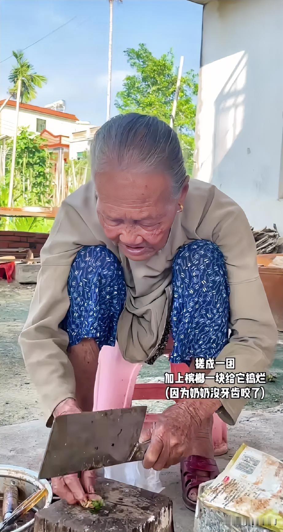 90多岁了,想吃槟榔的老人总有办法敲打,全海南的老人这法子拿捏它。阿婆牙齿掉完了