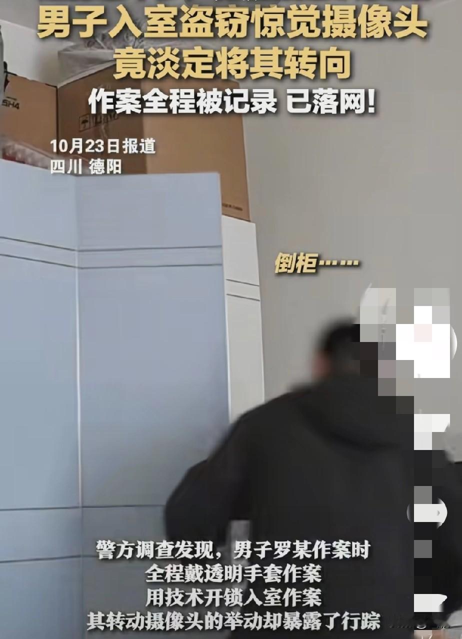四川德阳,王女士发现家里被翻箱倒柜的,700余元现金失窃,调出监控一看家里果然遭遇入室盗窃了,监控摄像头也是清楚的拍下了男子的作案过程。网友:道德感不多,防偷拍意识很强。 视频中,只见男子罗某戴着手套,在卧室里翻箱倒柜,正当他翻完衣柜,准备查看电脑桌时发现了摄像头,于是他淡定的过去把摄像头翻到了别的方向。他以为这样就万无一失了,其实罗某之前的行为早就被摄像头记录下来了。 你要是说罗某不聪明吧,可他会开锁,入室盗窃还知道戴个手套。可你要说他聪明吧,他戴了个手套却没带口罩,迟迟才发现摄像头。 有网友调侃,出门偷东西啥都带了,就是忘了带脑子。 接到报警后,民警也是很快的将罗某抓获,同时顺藤摸瓜还揪出了与罗某汇合的王某。 老话说得好“勿以恶小而为之”,哪怕是在路上捡个手机,连小朋友都知道要交给警察叔叔。不属于自己的东西,哪怕你再怎么喜欢也不能拿,更何况去入室盗窃这样的违法行为更是要不得。 别让一时的贪念,换来了一辈子的污点。 大人作为孩子成长路上的第一位老师,家长更应该用行动做好自己,比千万句说教都更能帮孩子立好人生的“标尺”。