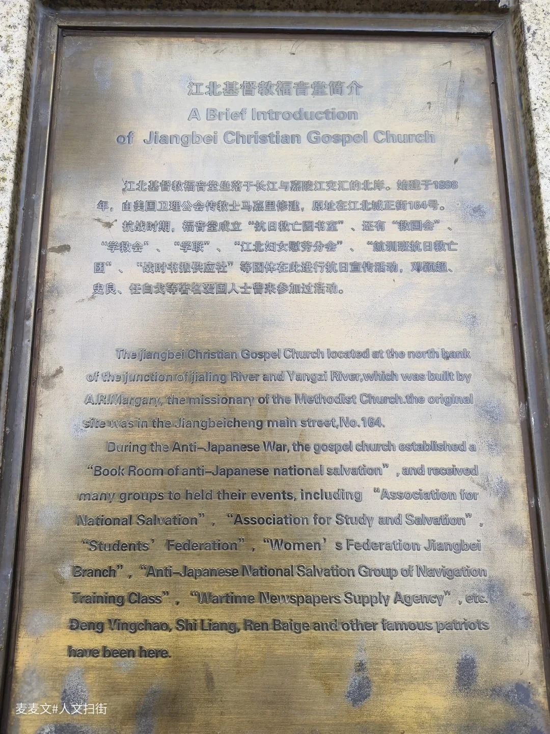 该堂前身与1894年江北教案相关,抗战时期曾设立战时救亡图书室并举办爱国演讲活动,邓颖超、史良等曾在此发表演说。1958年实行联合礼拜,文諽期间停止活动,1983年重新开放。2005年因江北嘴开发被列为迁建保护建筑,2006年启动搬迁工程,过渡至万丰一村后最终在现址重建。