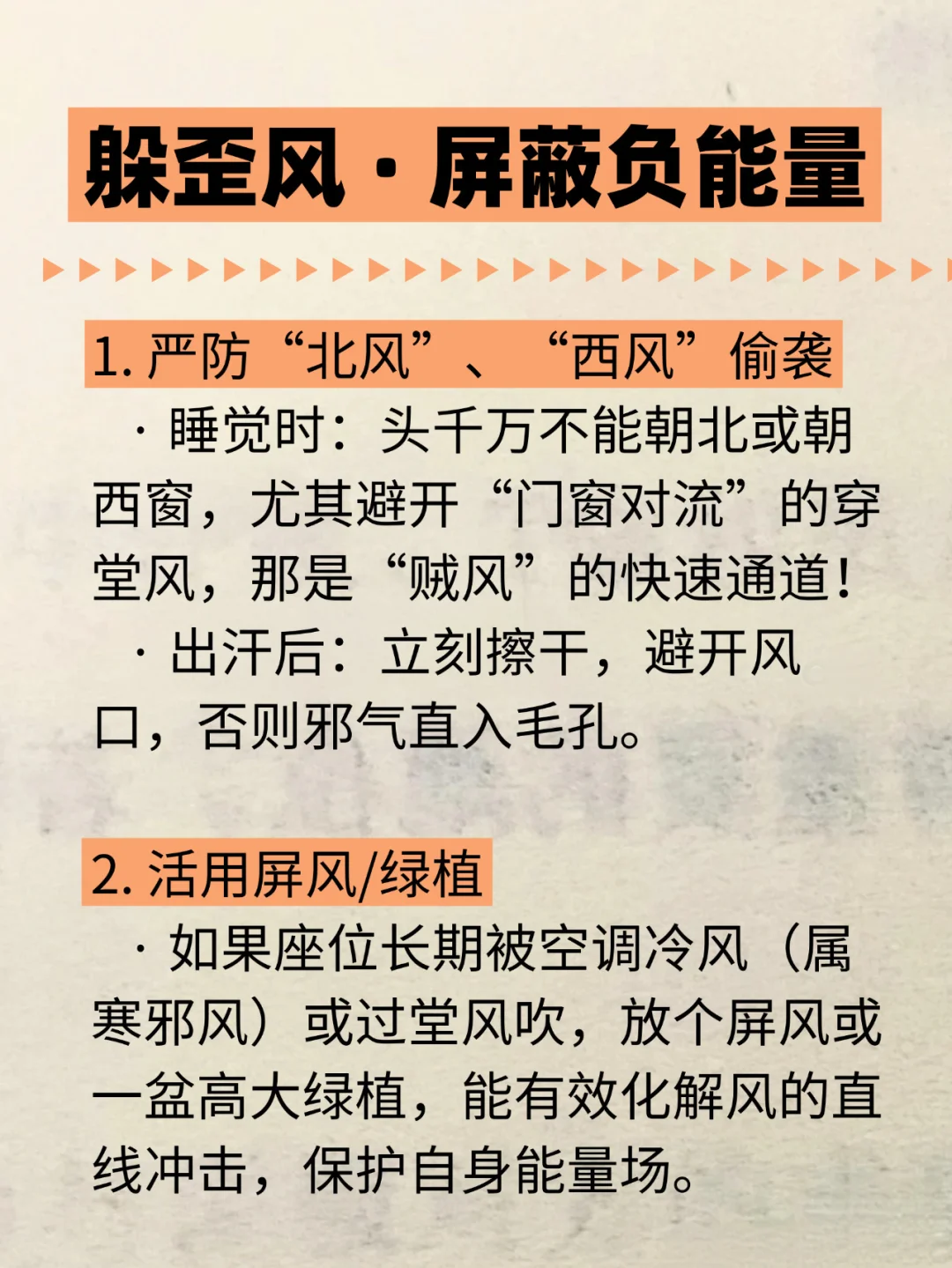 · 睡觉时:头千万不能朝北或朝西窗,尤其避开“门窗对流”的穿堂风,那是“贼风”的快速通道!