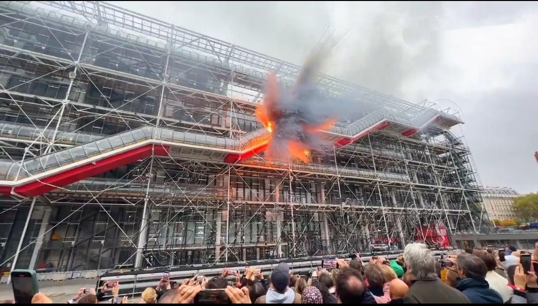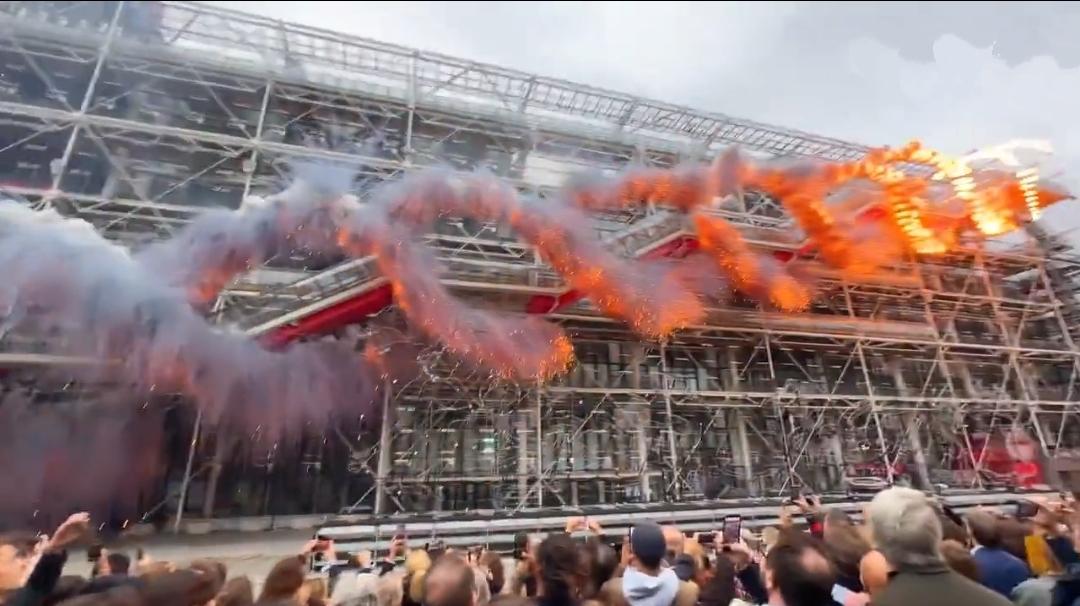 巴黎蓬皮杜艺术中心外墙上,20分钟里炸开的彩色烟雾像打翻的颜料盘,把这座几何感十