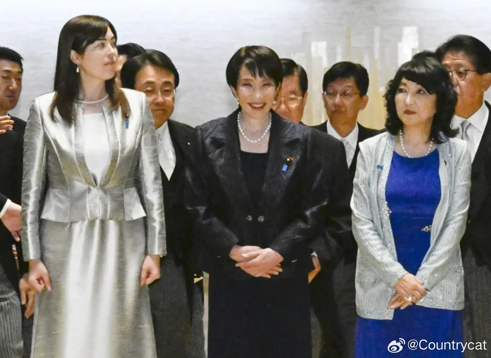 图2:日本首相高市早苗率领新内阁近日正式上任,身材高挑的经济安全保障担当大臣小野田纪美(图左),以一袭银色连衣裙出席任命仪式并与阁员合影,立刻引发社群热议。路透/Kyodo