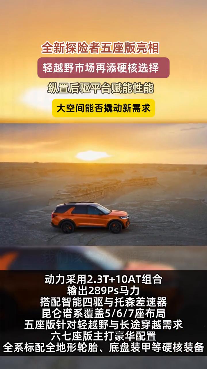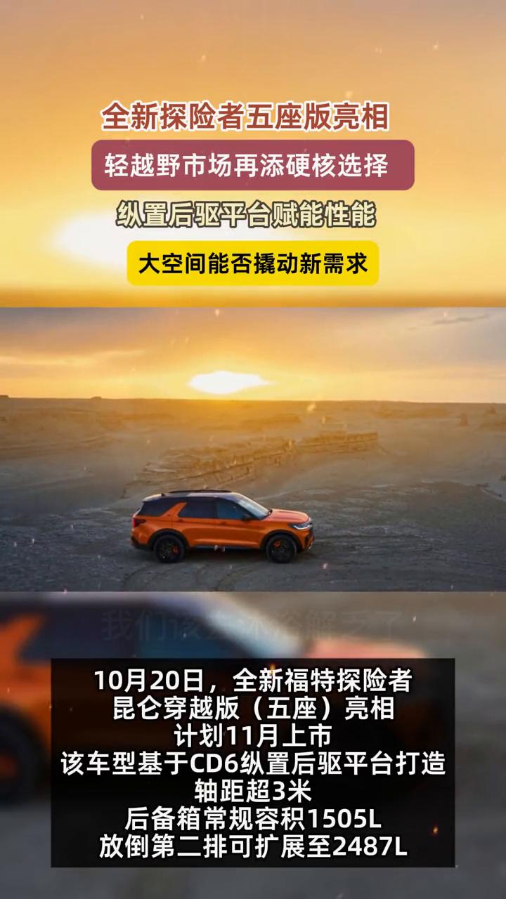 全新探险者五座版亮相,轻越野市场再添硬核选择。 纵置后驱平台赋能性能,大空间能否撬动新需求?10月20日,全新福特探险者昆仑穿越版(五座)亮相,计划11月上市。 该车型基于CD6纵置后驱平台打造,轴距超3米,后备箱常规容积1505L,放倒第二排可扩展至2487L。动力采用2.3T+10AT组合,输出289Ps马力,搭配智能四驱与托森差速器。昆仑谱系覆盖5/6/7座布局,五座版针对轻越野与长途穿越需求,六七座版主打豪华配置,全系标配全地形轮胎、底盘装甲等硬核装备。