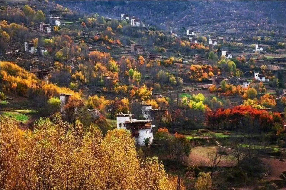 金秋的藏寨,树叶渐染红色,与空灵的山谷、清澈的溪流,构成了一幅田园牧歌式的多彩画卷。