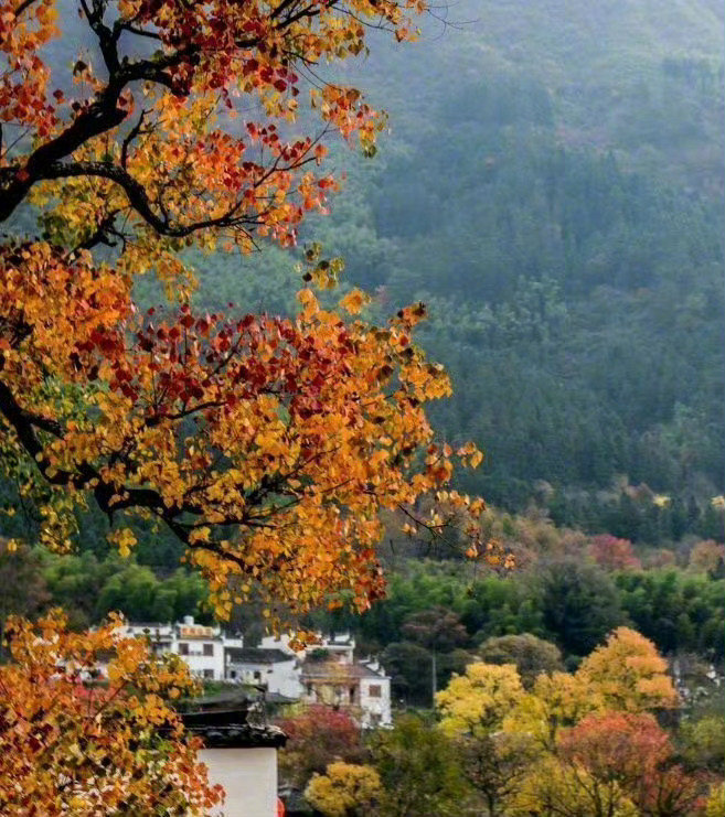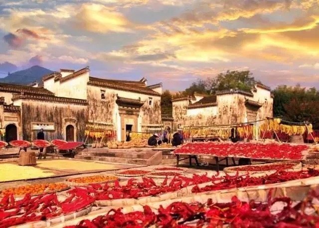深秋时节,房前屋后晾晒的辣椒、玉米、灯笼柿、黄豆等农作物,也给这徽派建筑的粉墙黛瓦增添了一抹亮色。