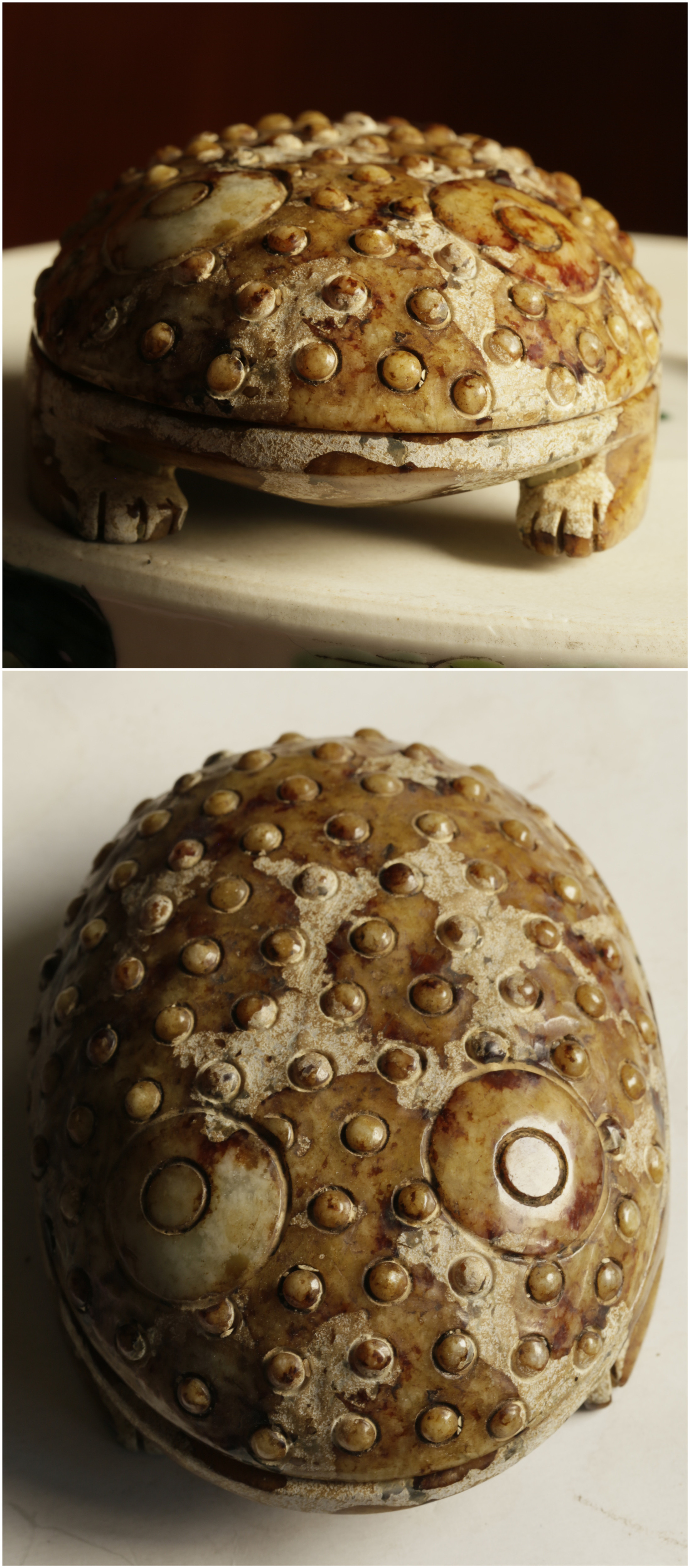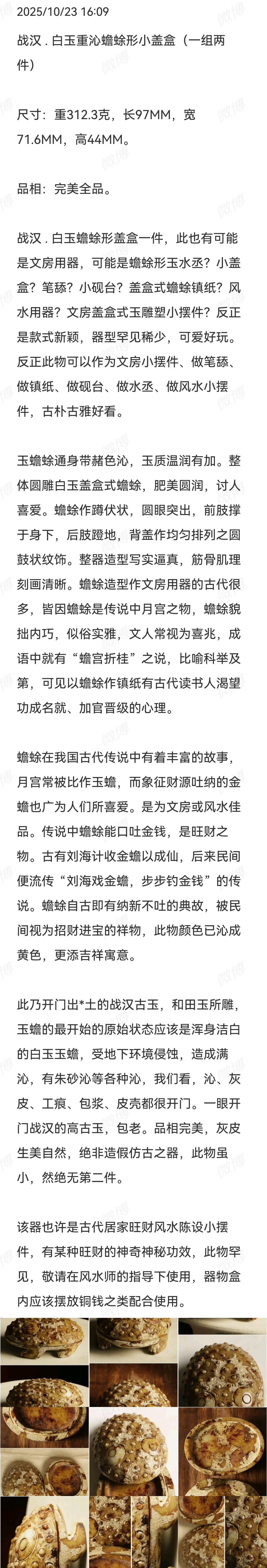 战汉 . 白玉蟾蜍形盖盒一件,此也有可能是文房用器,可能是蟾蜍形玉水丞?小盖盒?笔舔?小砚台?盖盒式蟾蜍镇纸?风水用器?文房盖盒式玉雕塑小摆件?反正是款式新颖,器型罕见稀少,可爱好玩。反正此物可以作为文房小摆件、做笔舔、做镇纸、做砚台、做水丞、做风水小摆件,古朴古雅好看。