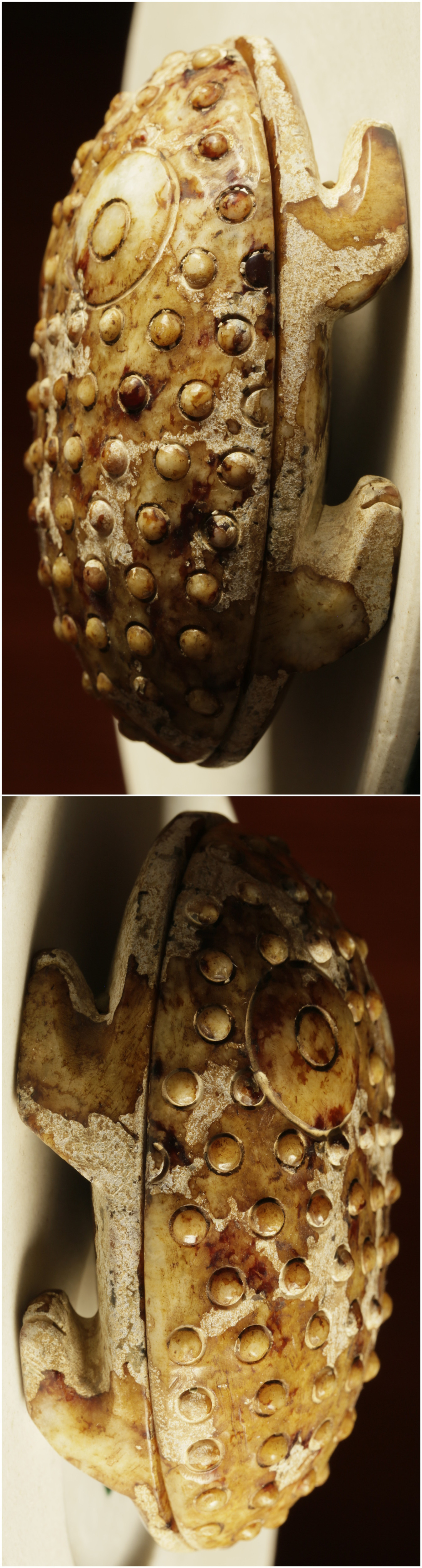 此乃开门出*土的战汉古玉,和田玉所雕,玉蟾的最开始的原始状态应该是浑身洁白的白玉玉蟾,受地下环境侵蚀,造成满沁,有朱砂沁等各种沁,我们看,沁、灰皮、工痕、包浆、皮壳都很开门。一眼开门战汉的高古玉,包老。品相完美,灰皮生美自然,绝非造假仿古之器,此物虽小,然绝无第二件。