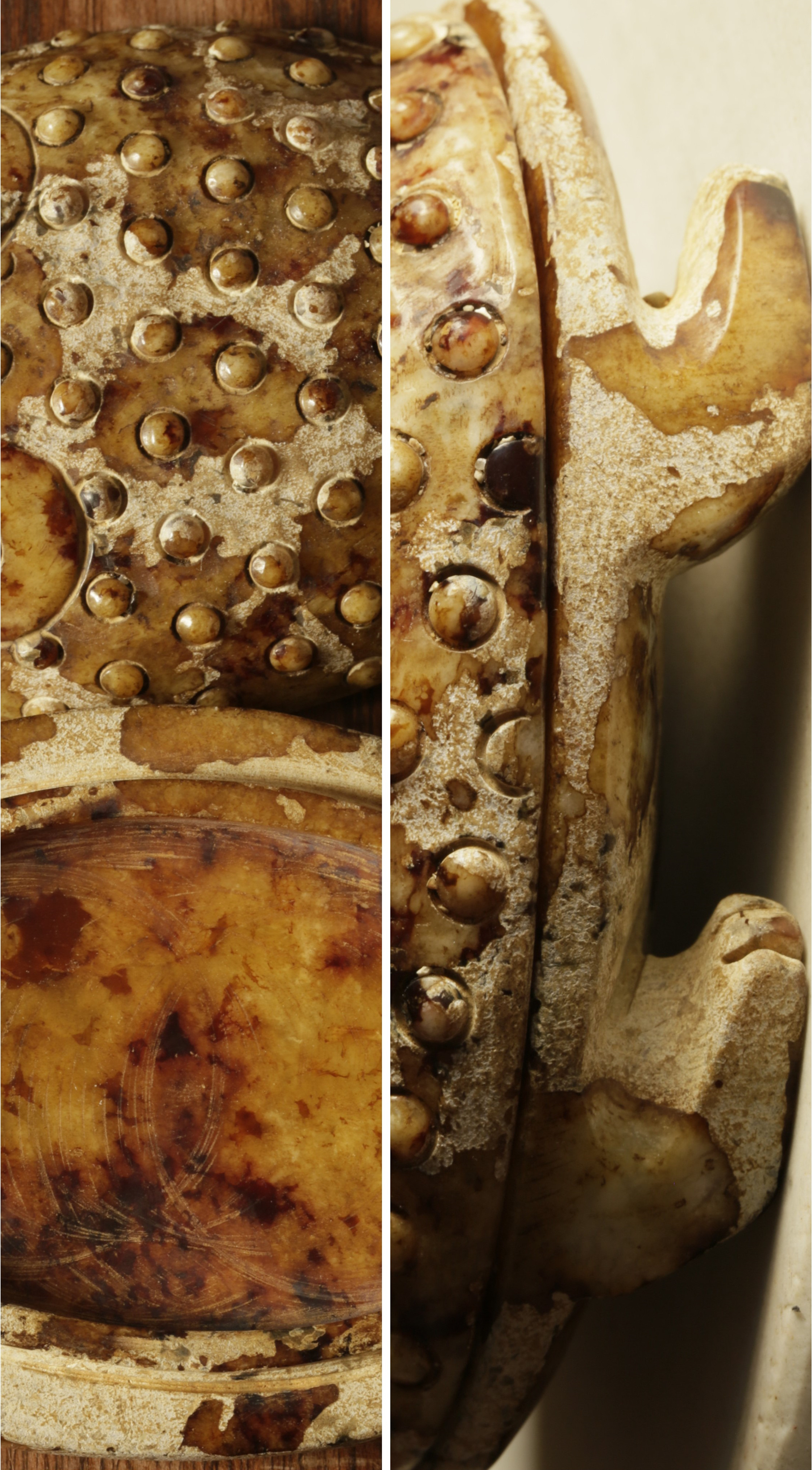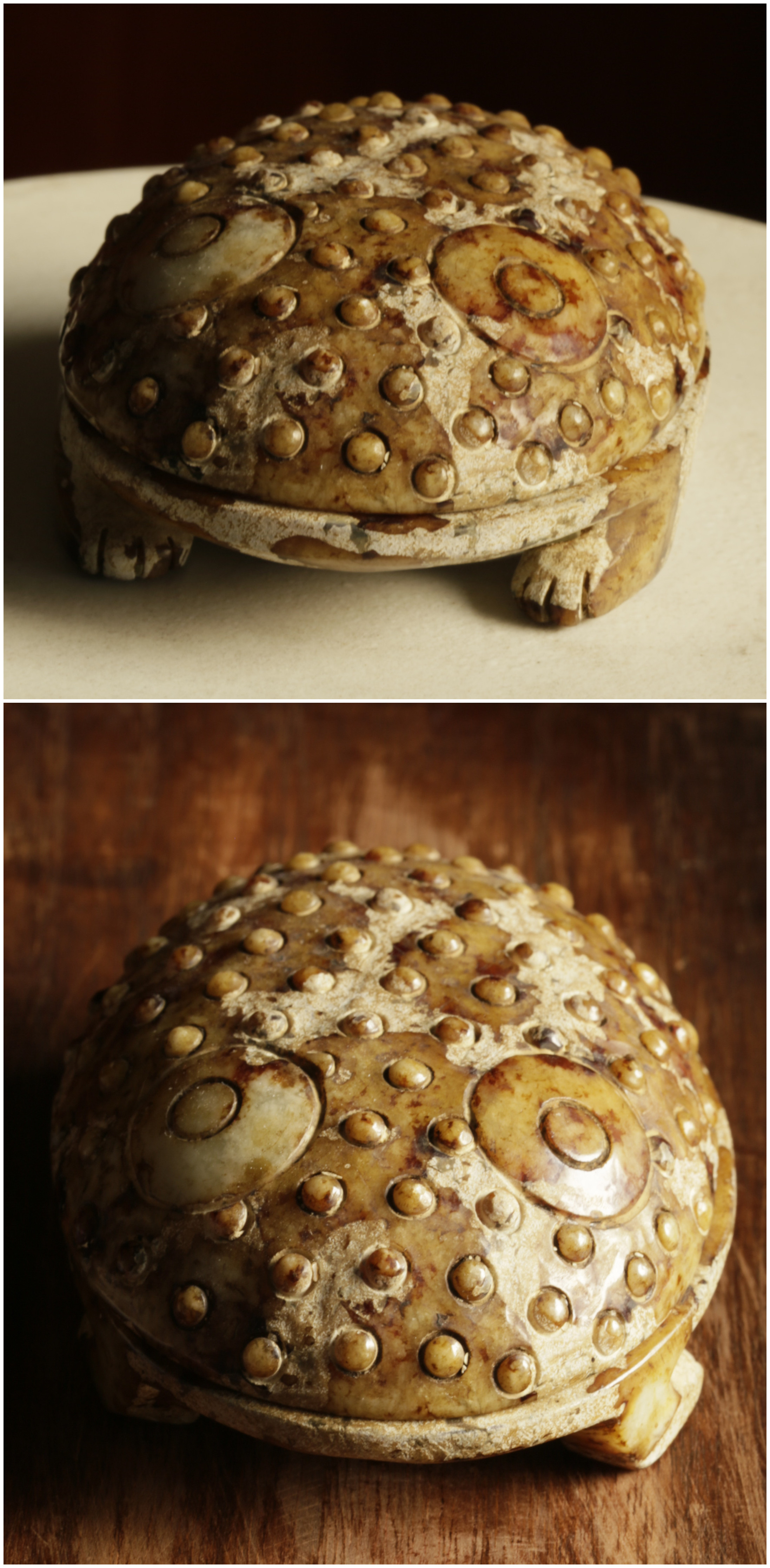 玉蟾蜍通身带赭色沁,玉质温润有加。整体圆雕白玉盖盒式蟾蜍,肥美圆润,讨人喜爱。蟾蜍作蹲伏状,圆眼突出,前肢撑于身下,后肢蹬地,背盖作均匀排列之圆鼓状纹饰。整器造型写实逼真,筋骨肌理刻画清晰。蟾蜍造型作文房用器的古代很多,皆因蟾蜍是传说中月宫之物,蟾蜍貌拙内巧,似俗实雅,文人常视为喜兆,成语中就有“蟾宫折桂”之说,比喻科举及第,可见以蟾蜍作镇纸有古代读书人渴望功成名就、加官晋级的心理。