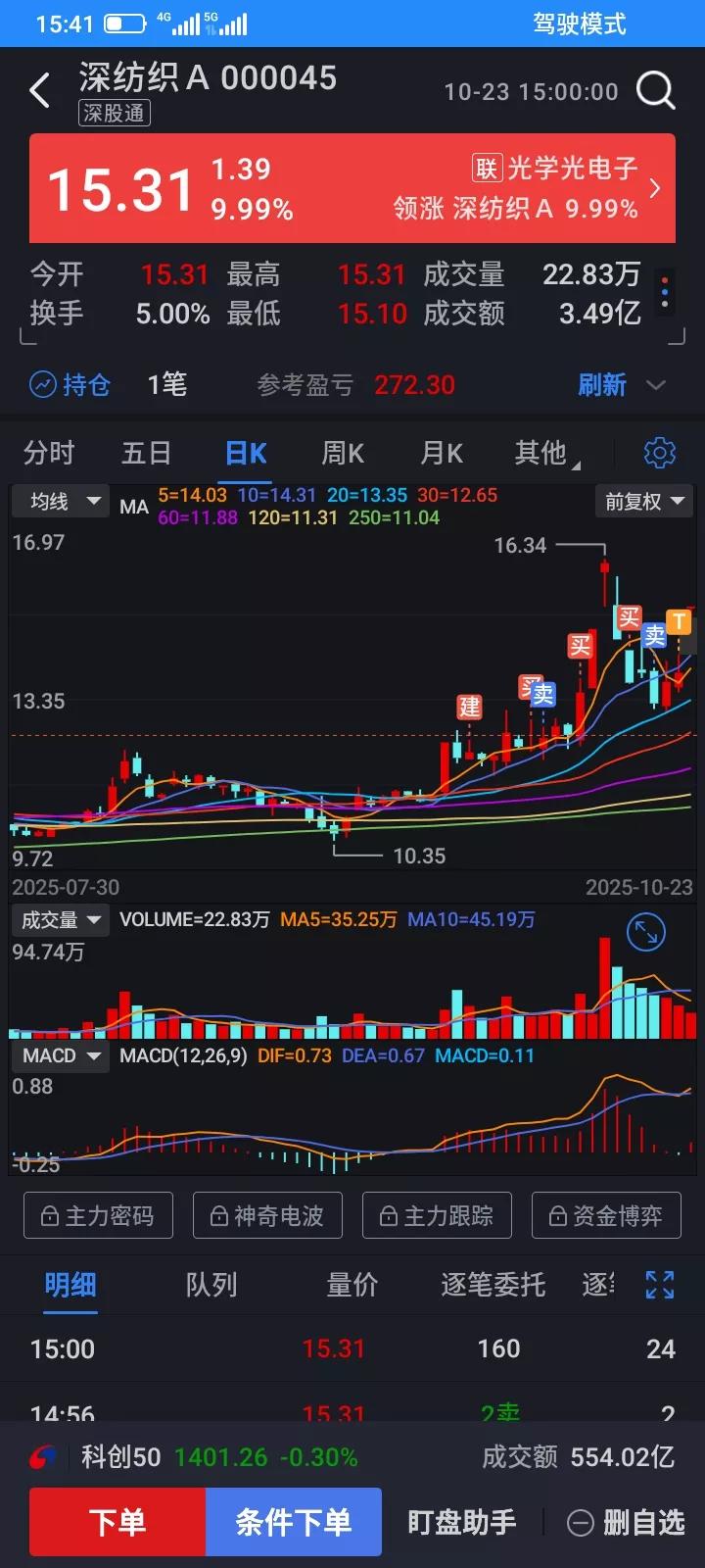 2025.10.23,今天开盘就15.31元涨停了,很快破板了,但是也很快又封住涨停了,我周一13.35元止损了200股,昨天t了100股,还亏了几块钱,又止损错了,损失了几百块钱,炒股赚钱太难了,不止损它就不断下跌,止损了就上涨了,总是感觉账户被监控了似的,主力总是缺我这仨瓜俩枣,把我洗出去就拉高上涨了,钱就在不断的止损中消耗掉了,本金越来越少。唯一庆幸的是,还留了100股,今天带来100多块利润,希望明天继续上涨,保住利润吧。