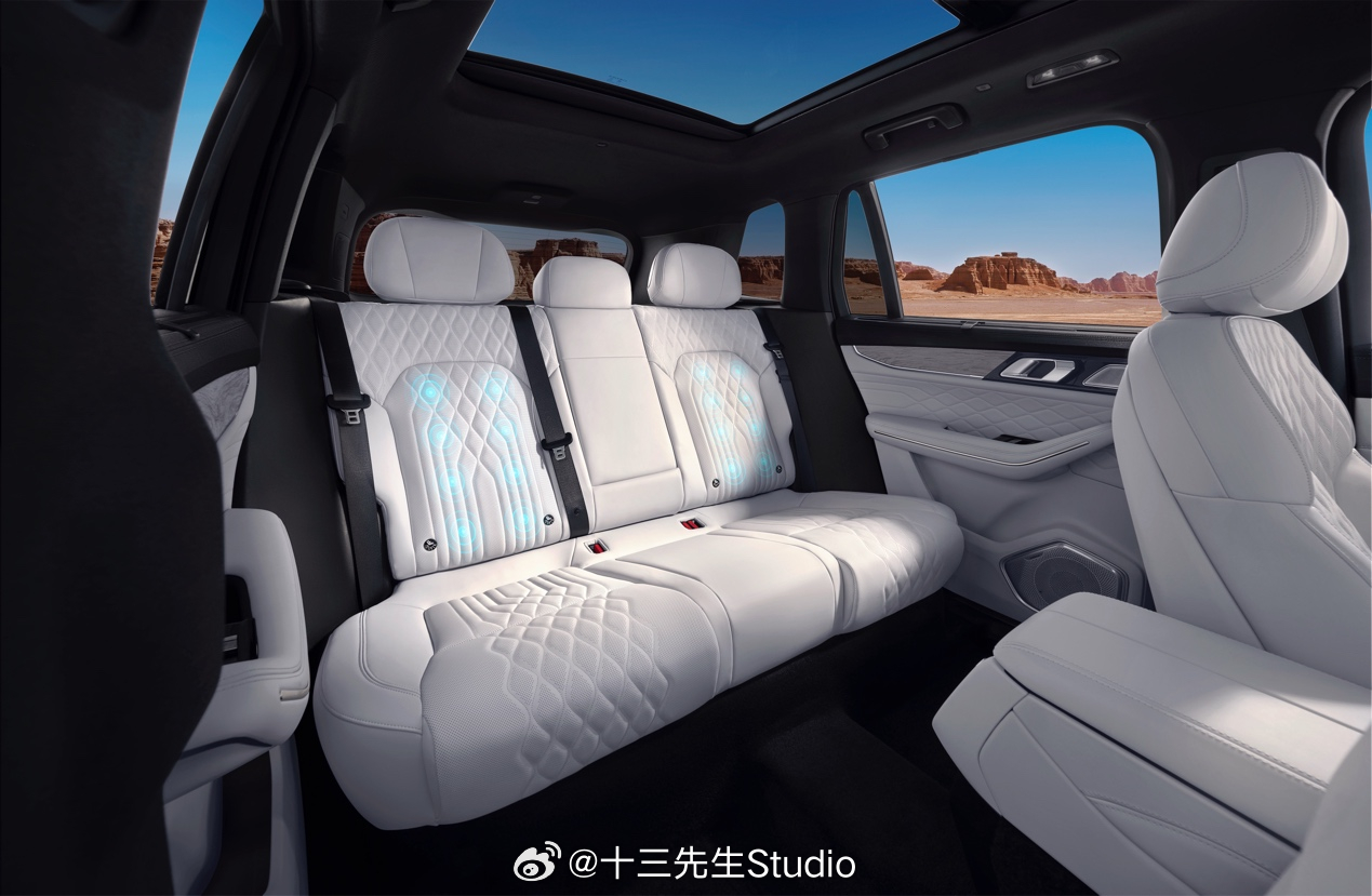 二排新增多功能中央扶手,全车Nappa真皮,四座三档加热、通风和8点式背部按摩、14扬Bose音响;副驾新增280mm一体式4向电动腿托。