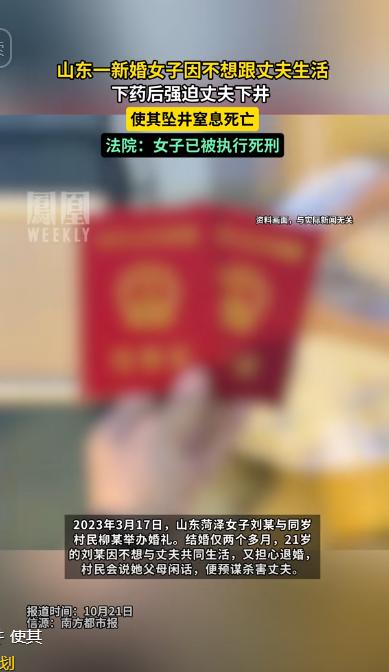 “比潘金莲还狠!”山东菏泽,21岁女子,新婚2个多月,她不想跟丈夫生活,又怕退婚父母被人说三道四,在丈夫喝酒后给他吃安眠药,连哄带骗让丈夫下机井捞鱼,不料,丈夫下井时坠入机井,4次求妻子找人救命,可女子开车往返多次,却没找人救他,之后,女子还将井盖盖上,丈夫最终因为缺氧窒息呼吸衰竭死亡,而法院判决让人拍手称快! 21 岁、相亲结婚、婚后两月、机井藏尸 , 山东菏泽这桩婚后命案,不是简单的 “毒妇杀夫”,而是乡村 “面子文化” 压垮人性的悲剧,更是法律严惩后仍需深挖的社会隐痛。 王女士(化名)经过村里人的介绍,和同村刘某(化名)相亲认识上了,经过一段时间的相处,两人在2023年结了婚,刚过两个月就想结束婚姻。 王女士说,在婚后觉得两人在生活中,很合不来,生活方式跟着很多不一样的地方,可她没敢提 “离婚”,反而选了最极端的路。 在五月底的时候,王女士和刘某去聚餐吃饭,吃饭的时候,丈夫刘某喝了点小酒,王女士看刘某喝多了,于是谎称 “解酒药”,让丈夫吞下数片复方地西泮,等丈夫意识模糊,把人诱到机井边推了下去。 之后,丈夫在井里苦苦求救时,她驾车往返几次,没喊人救援,反而亲手盖上井盖,眼睁睁看着对方窒息。直到被害人家属报案,警方才锁定她,最终移交司法机关。 这场谋杀的 “导火索”,说出来让人唏嘘,不是深仇大恨,是 “怕丢面子”。 据传王女士不敢提退婚,怕乡里人说闲话,怕父母在村里抬不起头。 为了 “保全” 家人的体面,她选择断送另一条生命,把 “面子” 看得比两条人命还重。 消息传开后,网友几乎一边倒地骂她 “狠心”,可骂声背后也藏着疑问:“不想过了为啥不离婚?” 没人细想,在有些乡村,“离婚” 可能比 “忍下去” 更难 。 要面对街坊邻居的指指点点,要承受娘家的压力,甚至可能被贴上 “不检点” 的标签。 而法院的判决很明确:利用夫妻信任实施谋杀,动机卑劣、手段残忍,依法判处死刑,这既是对被害人的交代,也是对 “亲密关系不是犯罪保护伞” 的重申。 但这起命案暴露的,远不止一个人的恶。农村里,婚姻矛盾想找个地方说理难 —— 没多少人知道可以找村委会、妇联或律师,遇到想不开的事,也没心理疏导的渠道。 就连邻里,可能也抱着 “家家有本难念的经” 不愿多管。要是当初王女士能找到人聊聊,能知道 “离婚不是丢人的事”,或许就不会走到这一步。 说到底,这起命案最该让人警醒的,从来不是 “凶手该杀”,而是 “如何不让悲剧再发生”。 乡村的 “面子” 再重要,也重不过一条人命,婚姻里的委屈再大,也不能用刀子和机井来解决。 基层村里该多些法律顾问、婚姻调解员,让想离婚的人敢开口,也该多讲讲法律常识,让大家知道 “面子” 换不来平安,违法必受严惩。 对此,你还有什么看法呢? 信息来源 :凤凰 WEEKLY