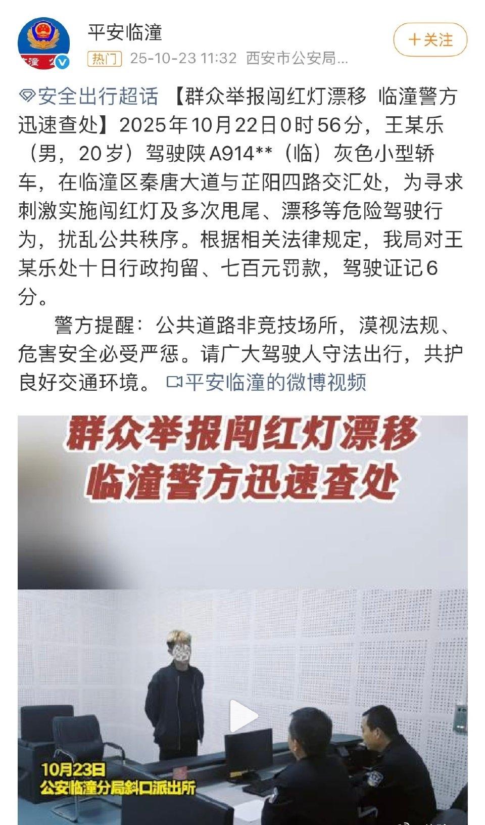 这年头,真有人把城市路口当自家赛道了。 10月23日,西安交警通报了一起案子,20岁小伙王某乐开着租来的小米SU7,凌晨在临潼一个红绿灯路口玩起了漂移甩尾,整整转了15秒,轮胎磨得直响,完事儿还闯红灯跑了。 结果市民行车记录仪拍得清清楚楚,举报才一天,警方就查了个水落石出。 车是临时牌照,但违法一点没跑,拘留10天,罚款700,驾照还扣了6分。 有人说“性能车容易让人上头”,可警方说得明白:方向盘在谁手里,责任就在谁身上。 这事儿看着刺激,实则后怕。 路上不止他一辆车,万一失控,后果谁敢想?年轻可以气盛,但马路不是游乐场。 法律不跟你讲“上头”,只认红线。 性能是好东西,但用对地方才是本事。