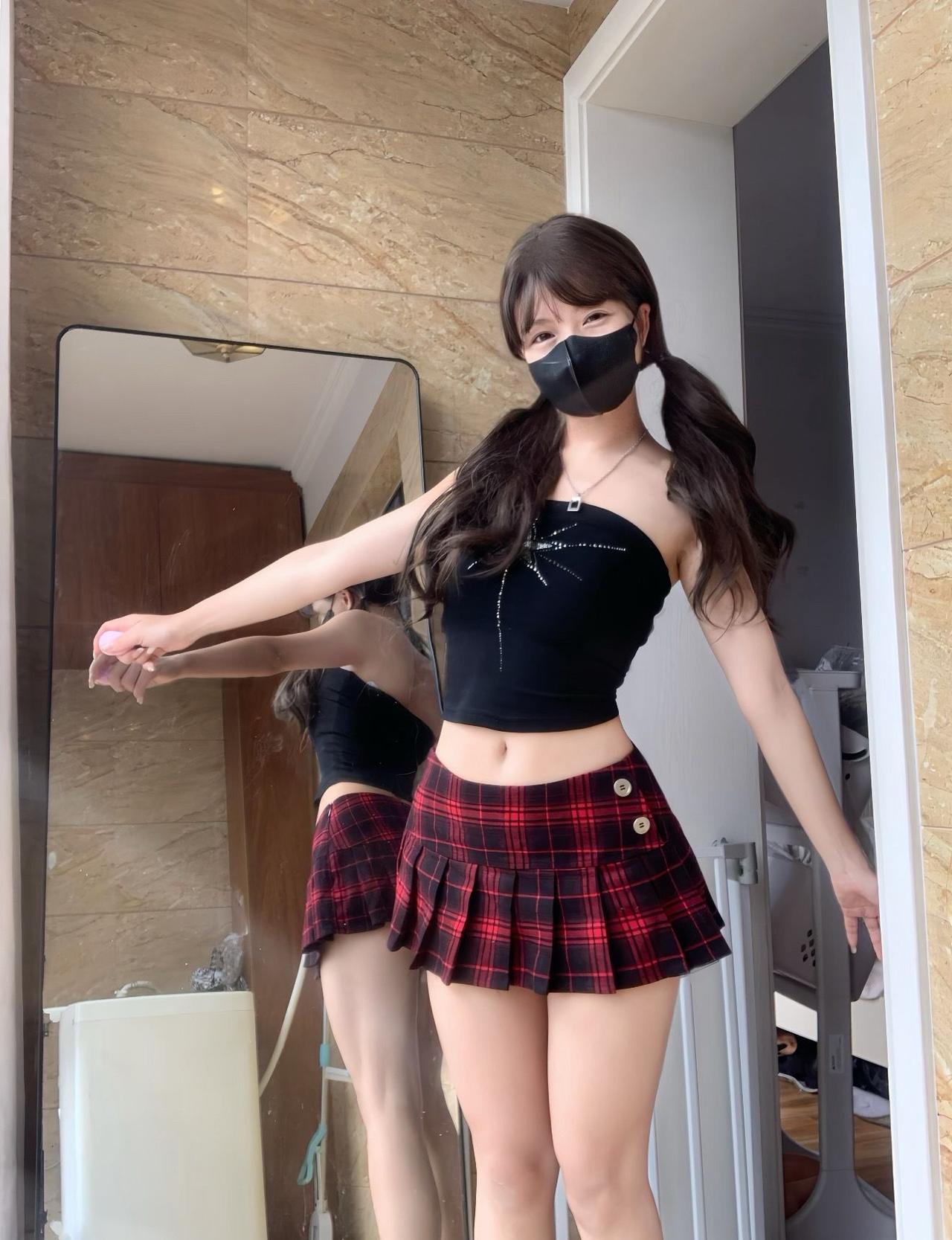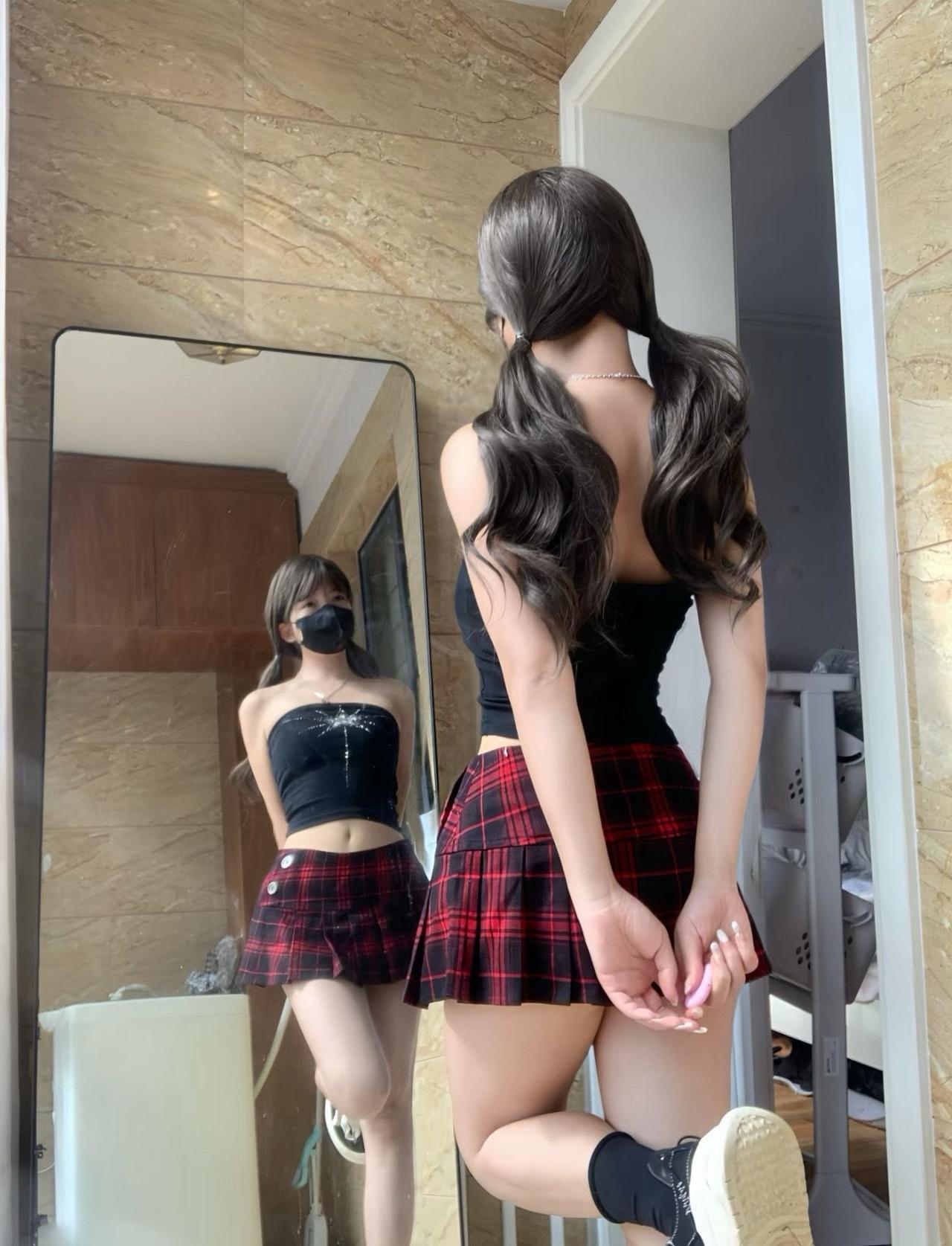 青春活力穿搭,黑背心+红格子短裙,时尚又减龄!💃🏻👗👠
