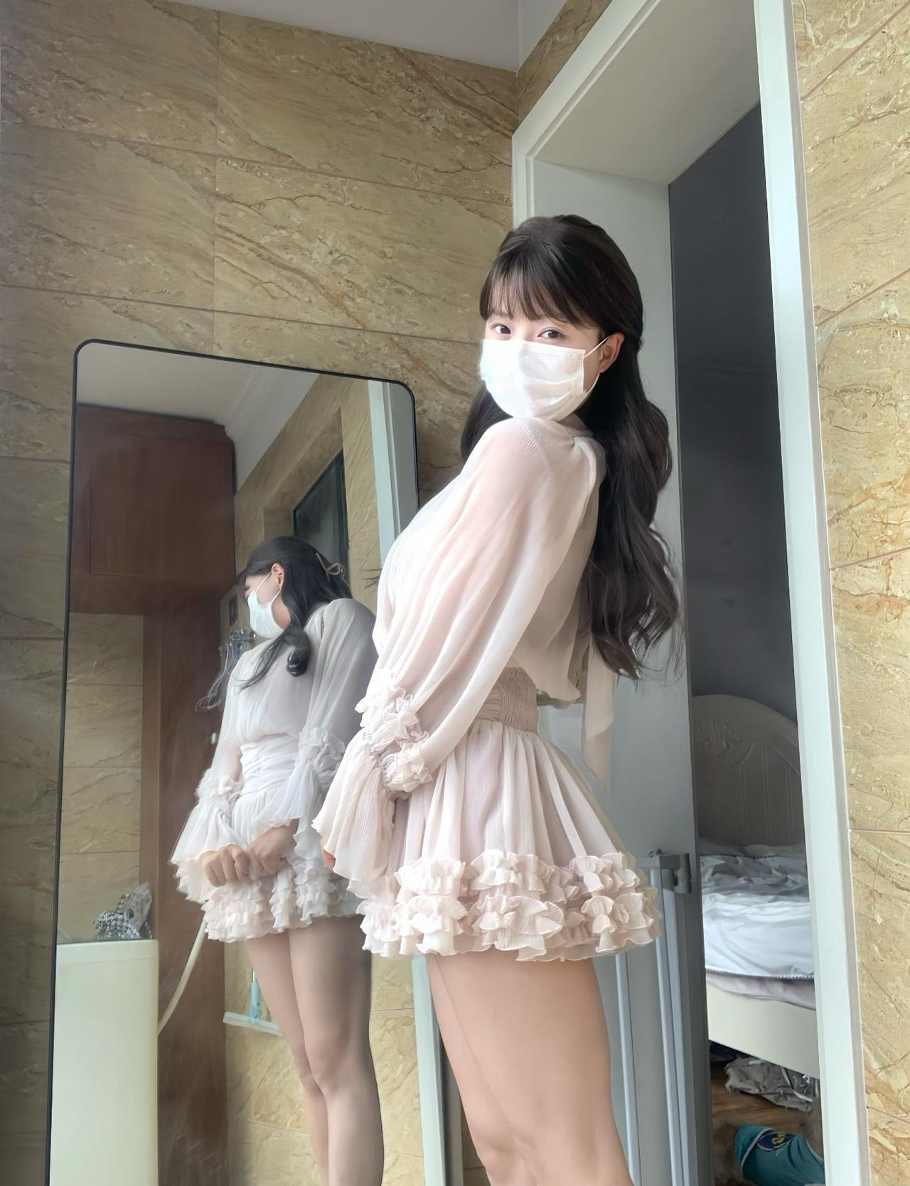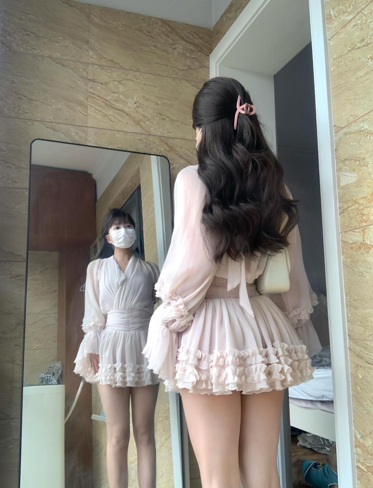 甜美少女风穿搭,粉色连衣裙搭配白色口罩,清新可爱!粉系少女穿搭