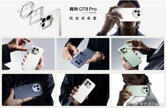 真我 GT8 Pro 首创机械拼装设计,后置镜头模组可切换四种形态,机身提供 AG 玻璃与类纸再生皮革配色。其核心搭载行业首发的理光 GR 影像系统,配备防眩光主摄,复刻五种经典胶片影调及 28mm、40mm 焦段,另有 2 亿像素潜望长焦支持 3 倍光学变焦。性能上采用第五代骁龙 8 至尊版与独显芯片 R1,搭配 2K 144Hz 屏幕及 7000mAh 电池与 120W 快充,首发 realme UI 7.0 并支持五年系统维护。