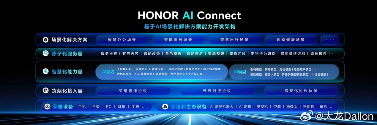 会上,荣耀发布“1×3×N”生态战略,“1”是HONOR AI Connet平台,开放AI能力;“3”为三种赋能模式;“N”覆盖多个产业集群。同时,HONOR AI Connect平台全新升级,降低合作伙伴接入门槛,推出A系列模组。荣耀还发布8大AI场景化生态解决方案,覆盖多领域,并向行业开放。