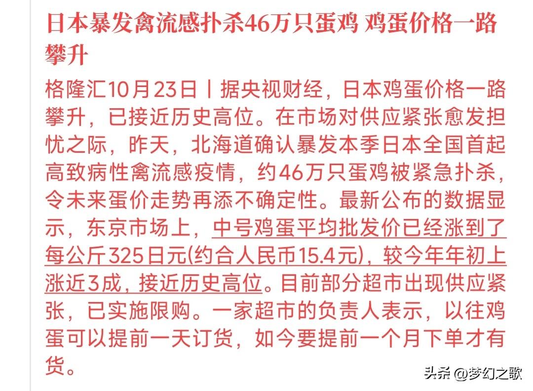晚上,养殖业迎来重磅利好消息 新一轮的禽流感又来了,而且离中国很近,日本已经爆发,已经开始扑杀鸡禽了,造成了鸡蛋的大幅涨价。 这么近的距离,海鸟完全有可能会把禽流感病毒带到我国境内,对于家禽来说是一个巨大的威胁,同时家禽肉类和蛋类都有涨价的预期了。 养殖业板块今天下午就开始了大幅度的反弹,这个消息对于养殖业来说是重磅利好,对于养殖业公司来说就是业绩的提升的开始,接下来一段时间很可能养殖业会出现大幅度的拉升。