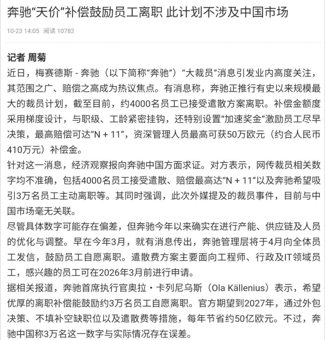 网传奔驰裁员补偿N+11我刚开始看的时候以为是N+1,仔细一看N+11,那一刻真