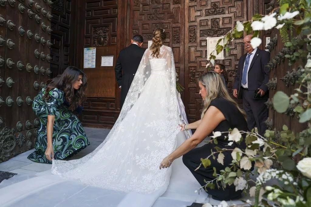 介绍一场上周末举行的板鸭贵族婚礼 新人分别来自两个显赫的家族,新郎雨果(Hugo Hernández-Mancha,40岁)是官二代;新娘玛利亚-路易莎(Maria Luisa Arróspide,30岁)则贵圈相关,博伊尔侯爵的闺女。板鸭媒体说她家是19世纪科尔多瓦城历史最悠久的贵族家族之一 不造哪边的关系,宾客可见汉诺威老二克里斯蒂安和老婆亚历珊德拉(他们长住马德里) 新娘婚纱来自本土品牌Navascués,设计理念小作文框框写,在我看来披肩、婚纱主体和最下面的纱完全不搭噶,看着奇奇怪怪的= = 不过如标题所说,祖母绿王冠+耳环真心不错。讲真对天主教or不介意改新教的贵圈年轻男性而言,在西班牙乌央乌央的贵族里捞个有家底的妹子是对瓜路眼球很友好的事情啊(瞎dream无指代)