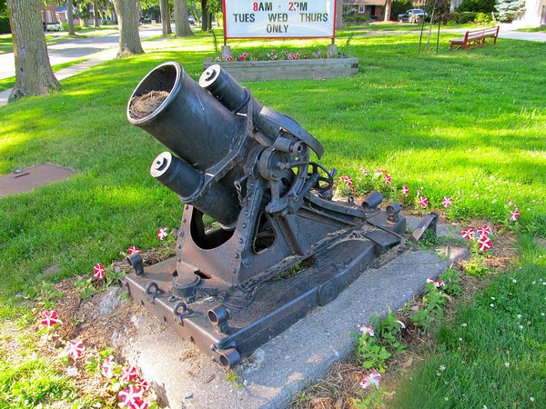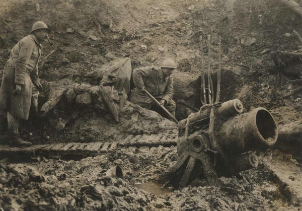 1917年索姆河前线堑壕中,法国士兵和一门缴获的德制250毫米重型掷雷器(25 cm schwerer Minenwerfer)。 所谓重型掷雷器,其实是一种前装的线膛迫击炮,配有液压反后坐系统。这是日俄战争后,莱茵金属公司依据旅顺攻防战经验为工兵部队研制的,用来摧毁普通火炮无法对付的碉堡和工事。它可发射97千克重的常规炮弹和50千克重的地雷弹,有效射程540米,最大射程970米。 因为初速低,这两种炮弹的壳体都很薄,炸药装填系数比一般炮弹大很多,并且可以使用抗冲击性能比较差的代用炸药。虽然射程短,但其穿透工事的威力几乎和420毫米口径的大贝尔莎攻城炮不相上下,而大贝尔莎的重量是重型掷雷器的50多倍。战争爆发时德军中共有44门重型掷雷器,战争结束时的装备数已达1234门。