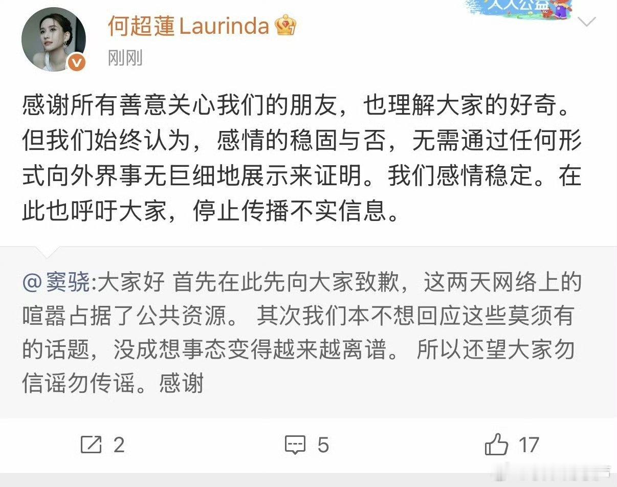 窦骁何超莲辟谣婚变两个人幸福就好大家还是不要信谣言了,专注自己生活吧,别总盯着别
