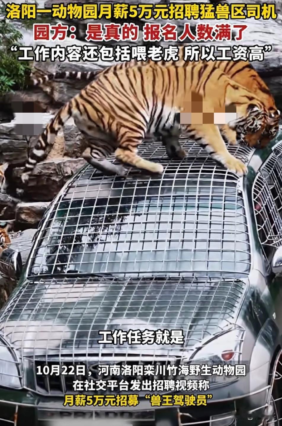 炸裂 洛阳一动物园月薪5万招猛兽区司机 报名直接爆满 工作内容是在猛兽区开车还得喂老虎 热评有人直呼:“这钱给我我都不敢赚,小命要紧!” 也有人羡慕:“月薪5万,就算天天跟老虎待着也值了!” 高工资背后是高风险,这到底是机遇还是陷阱 要是给你5万月薪,让你去猛兽区开车喂老虎,你敢不敢干?