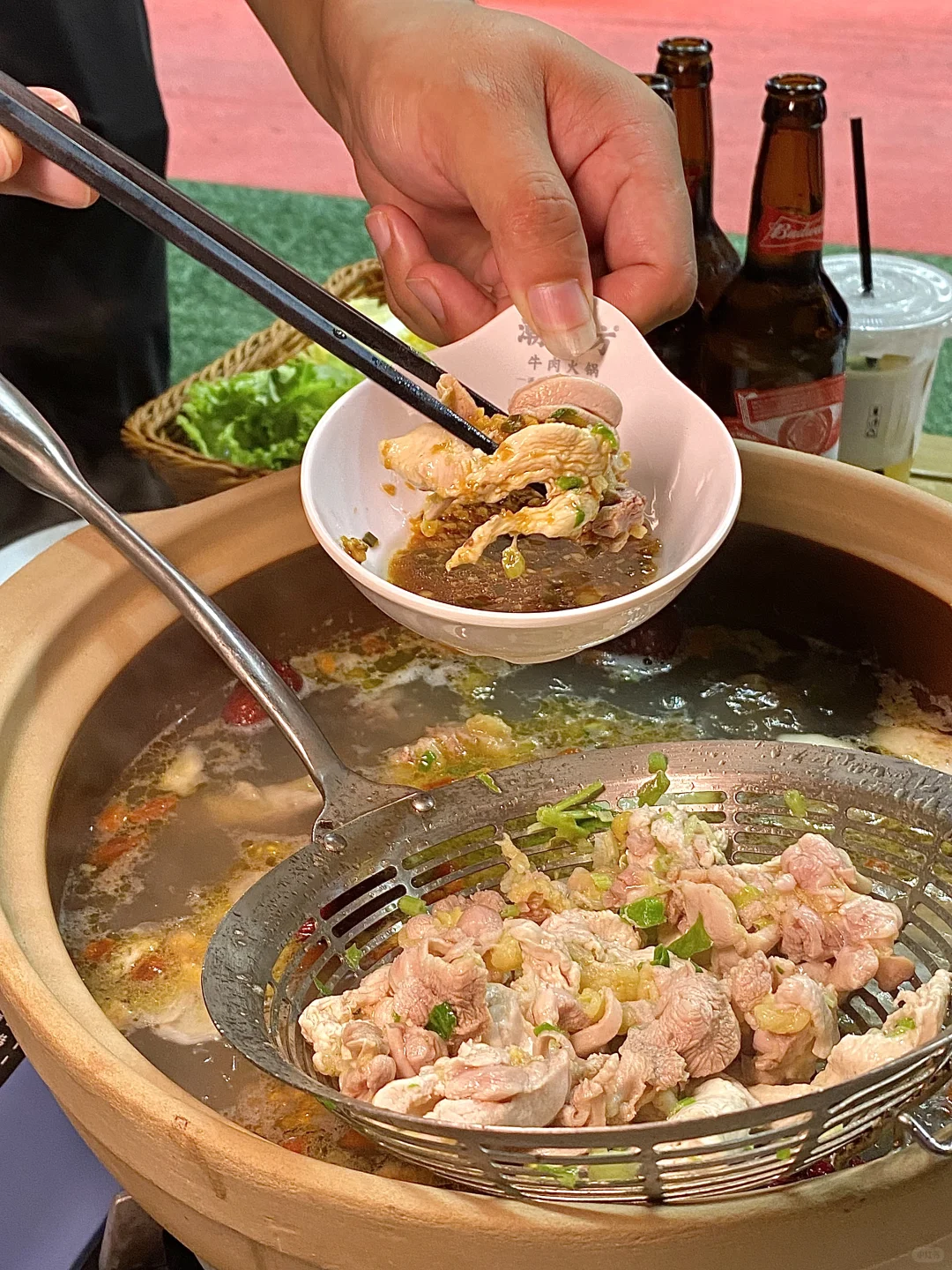 ✔️不妨先涮肉,明档看得的清远鸡,鲜切取肉!再喝汤,每一口都是原汁原味的鲜醇,新鲜肉眼可见,品质绝对杠杠的!
