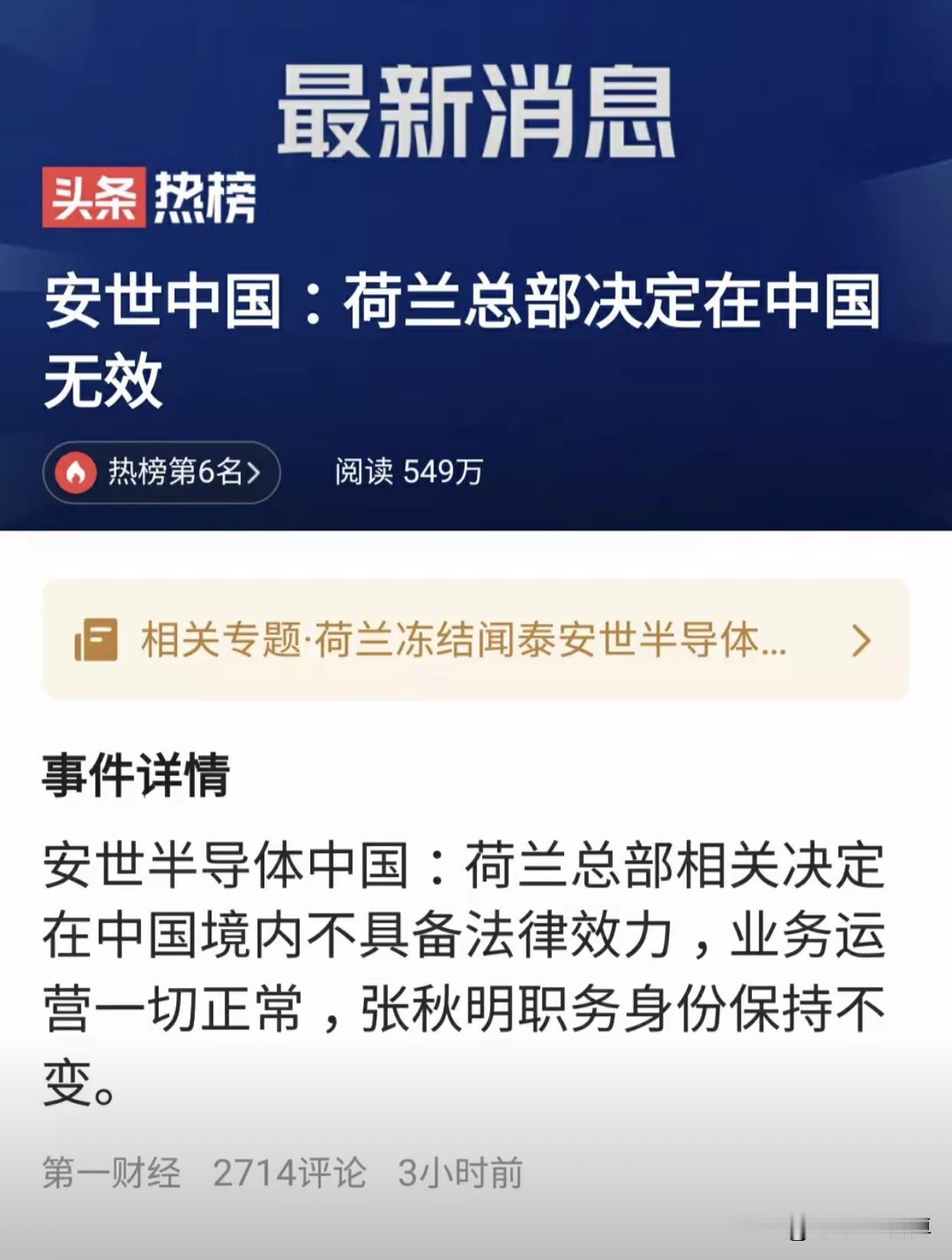 安世半导体中国正面硬刚荷兰安世总部:荷兰总部决定在中国无效! 其实早就应该直接这样摊牌了,没必要去顺着荷兰那边的思路走,对于“明抢”行为,讲道理的用处不大,张秋明职务身份保持不变,就能体现中方的强硬态度! 更硬核的是,安世半导体中国已经着手准备应急预案,包括法律应对措施,部分预案已经取得了效果。最起码,员工方面基本上已经是稳定住了,没受到太大的影响,这架势是要正面硬刚到底啊。 荷兰那边想收紧中国区的运营自主权,没想到碰上了硬骨头。 安世半导体中国区这些年业绩持续走高,占全球营收比重越来越大,腰杆子确实够硬。要知道,安世半导体在中国拥有超过上千名员工和多个生产基地,而关注他们的,更有千千万万个华夏儿女,这可不是随便能撼动的。 现在就看荷兰总部怎么接招了——是继续施压还是各退一步? 这次对抗的结局,很可能成为跨国公司在华运营的一个分水岭——是延续过去“总部高高在上”的指挥模式,还是转向更尊重本地市场实际情况的平等伙伴关系,安世内部的这场较量,正在为整个行业提供一个现实的观察样本。