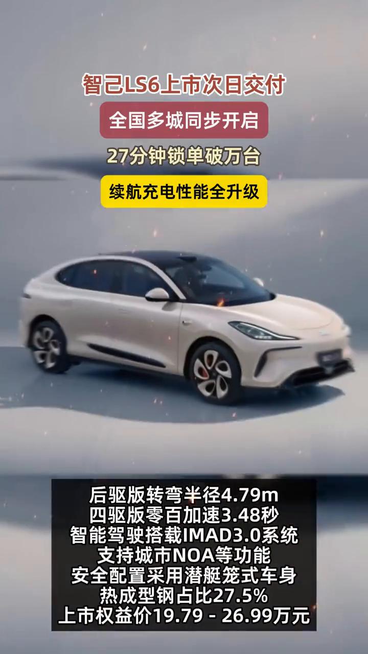 智己LS6上市次日交付,全国多城同步开启,27分钟锁单破万台,续航充电性能全升级。 新一代智己LS6上市次日开启,全国多城同步交付,上市27分钟锁单量突破10000台,周末两天锁单量超5000台。 该车搭载66kWh电池,CLTC纯电续航超450km,综合续航超1500km,支持800V高压超快充。配备灵蜥数字底盘2.0,后驱版转弯半径4.79m,四驱版零百加速3.48秒。智能驾驶搭载IMAD3.0系统,支持城市NOA等功能。安全配置采用潜艇笼式车身,热成型钢占比27.5%。 上市权益价19.79-26.99万元。