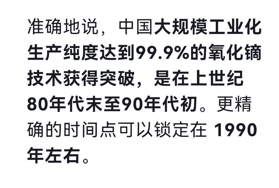 美国公司宣称生产出纯度99.9%的氧化镝,号称"打破中国垄断"。目前每月产量0.0085吨,也就是8500克。而中国月产量292.9吨,是美国34万倍。 中国大规模生产纯度达到99.9%的氧化镝,是上世纪80年代末至90年代初,35年的差距,不是靠激情可以弥补的。目前我们应用的纯度是99.999%,因为我国有溶剂萃取工艺。 这就像配方,也许他们通过各种手段配方的成分,但不掌握具体的比例,而且这个配方还是不断继续完善的。再退一步说,就算掌握了配方比例,没有完善的基础建设,也无法真正应用。 练就现在的稀土神功,我们用了六十年,花费了海量的资金。我们就算把所有的技术都给美国,美国没有十万亿美元投入和至少十年的基础建设,也达不到中国目前的水平。这还只是氧化镝,其他的差距更大。