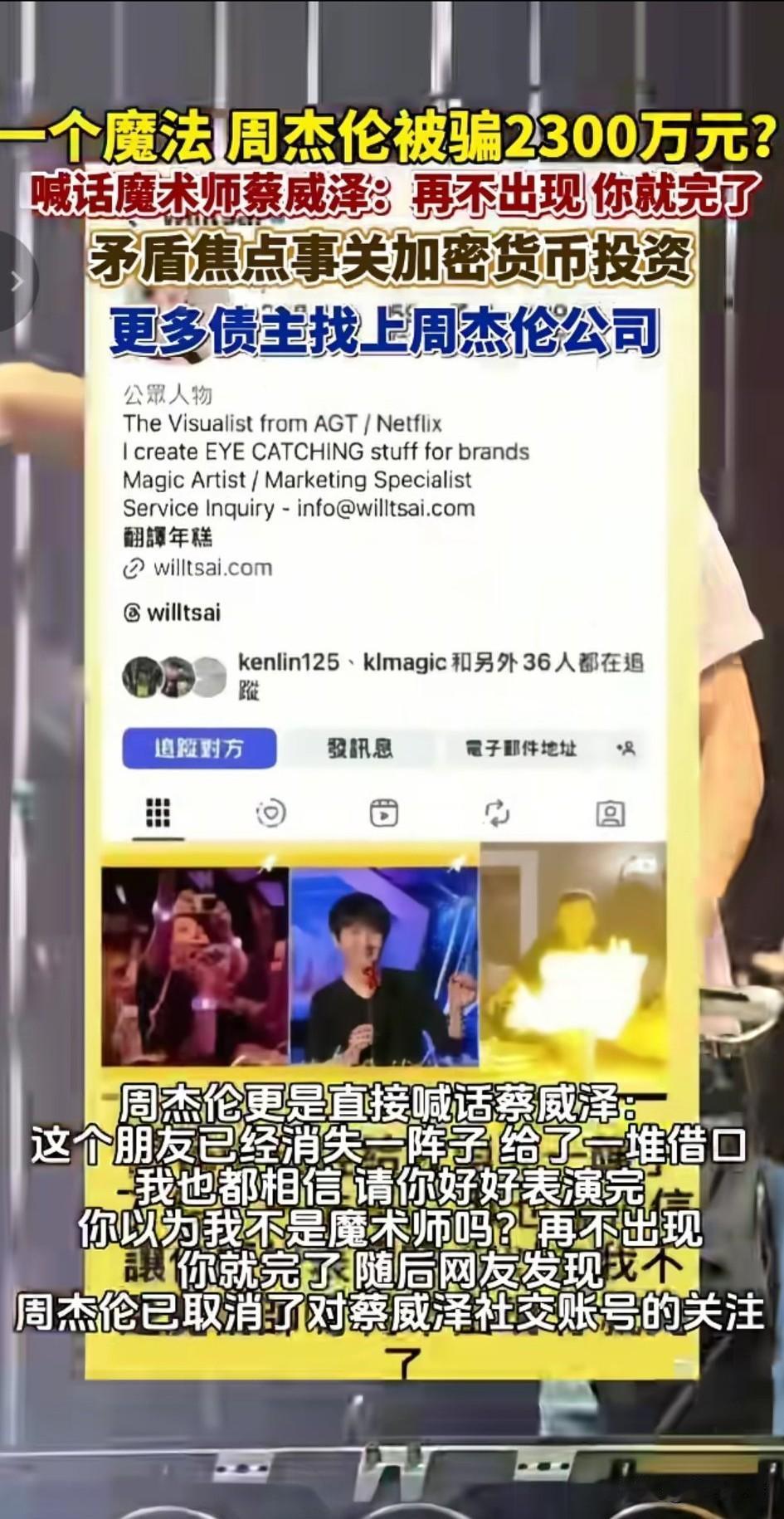 周杰伦向昔日魔术师好友蔡威泽喊话, 再不出现你就完了, 周杰伦此前苦苦寻找蔡威泽数月, 实在找不到对方, 看来是被逼急了, 原来两个人关系特别好, 蔡威泽甚至可以自由出入他的家, 两人在一块耍酷玩魔术, 如今许多债主找不到蔡威泽, 就跑到周杰伦公司来闹, 周杰伦头都大了, 没办法只能公开喊话好兄弟, 魔术表演完了赶紧出来吧! 看来周杰伦是被逼急了, 也顾不上自己的脸面了, 于是就有了这一出大戏, 加密货币容易暴富, 也容易让人赔的倾家荡产, 这位魔术师应该是赔光自己的家产, 也输光了别人的委托的资金, 只能是躲了起来! 大家觉得周杰伦能找到魔术师好友蔡威泽吗? 周杰伦最美的一句歌词是什么 周杰伦 台湾周杰伦