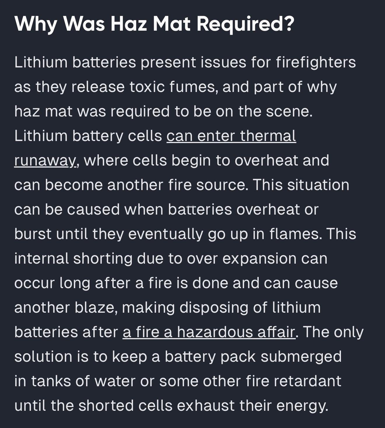 不过需要特别强调的是,虽然处理火情动员了处理锂电池失火的危险化学品小队,但这不代表起火的原因是锂电池,电芯过火也是有热失控风险的。