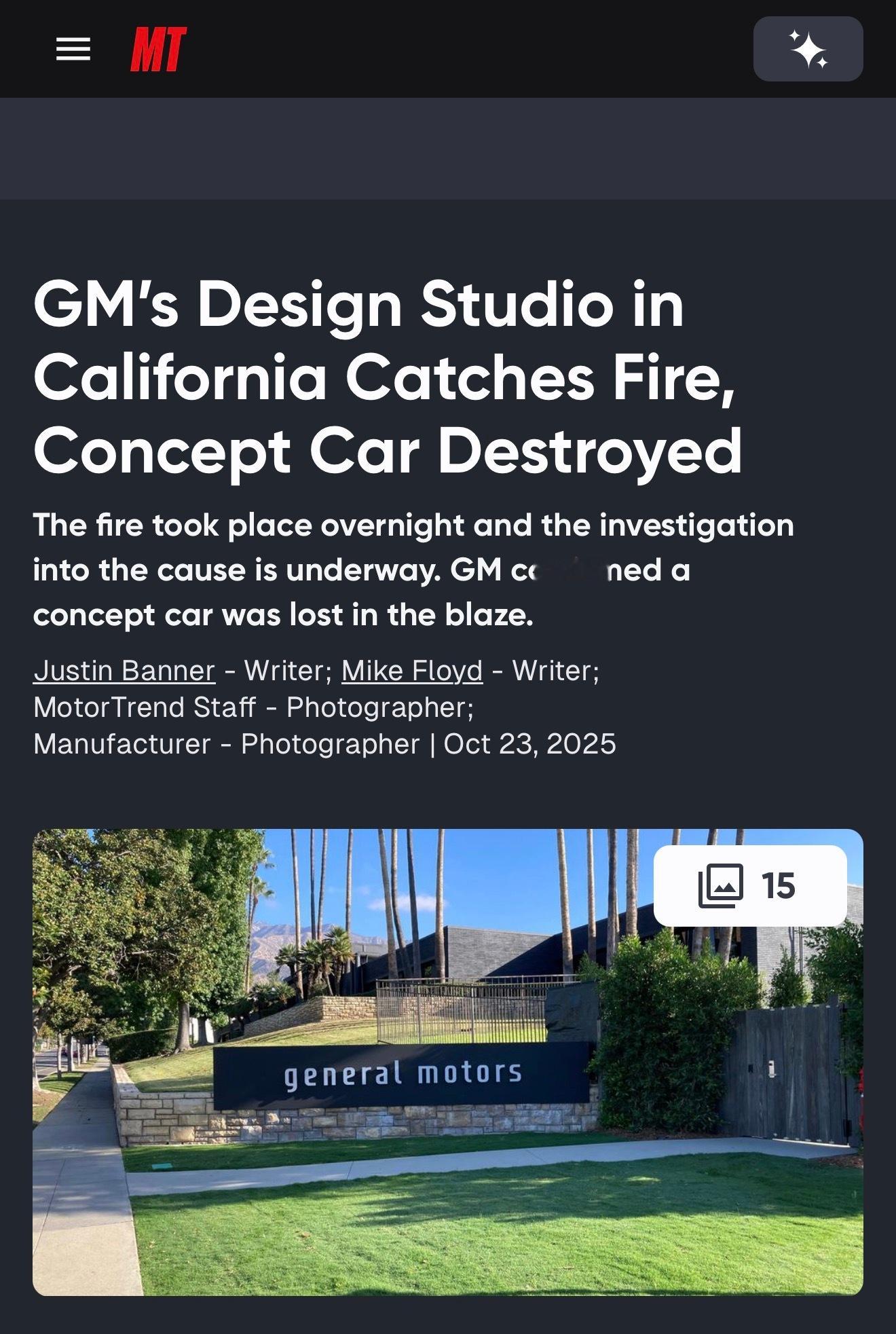 通用去年刚刚投入使用的加州帕萨迪纳设计工作室半夜起火,火灾造成至少一辆概念车被毁。