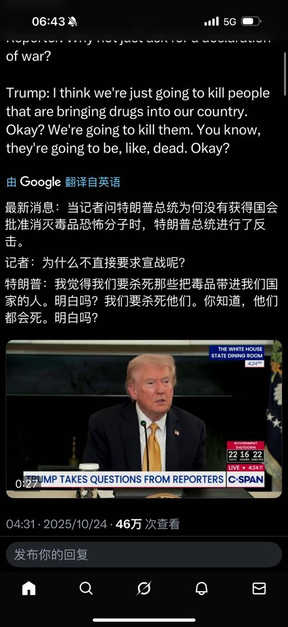 白宫:美军对阿拉瓜油毒品恐怖分子实施打击。