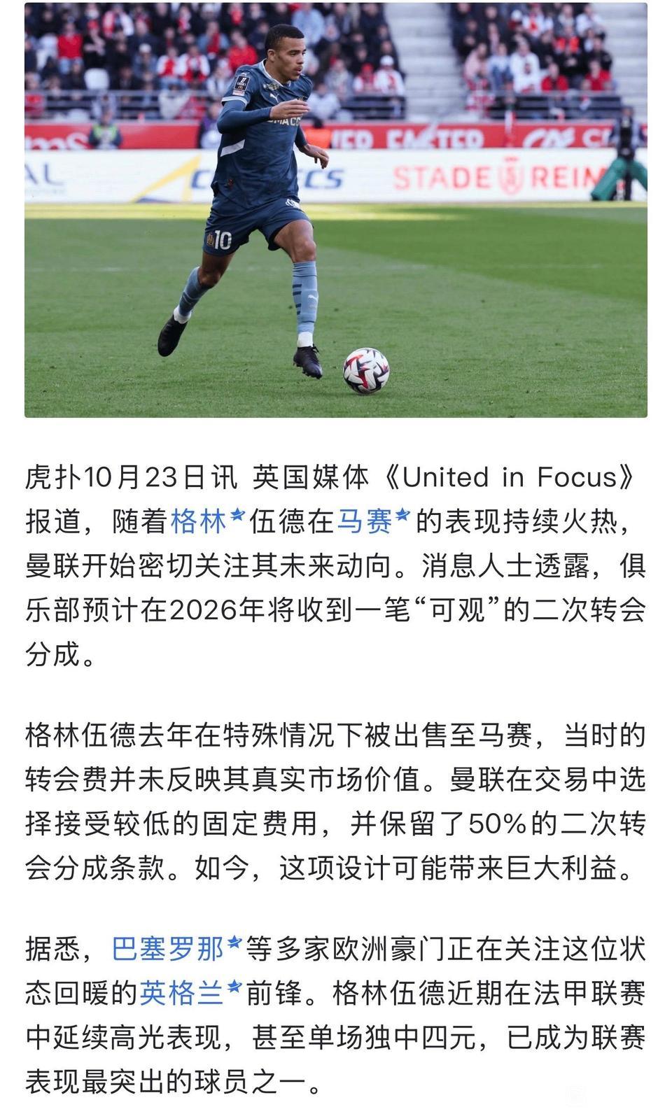 曼联还有法甲帝星,格林伍德50%的二次转会分成呢! 如果哪个豪门买他,曼联还能赚一笔。 巴萨就看中格林伍德,在法甲踢得真不错。 但是巴萨没那么多钱,希望大巴黎看中花个1亿,曼联还能分5000万呢。 他踢英超不行,踢法甲真的很棒,最近单场进4球,傲世法甲的存在![偷笑]