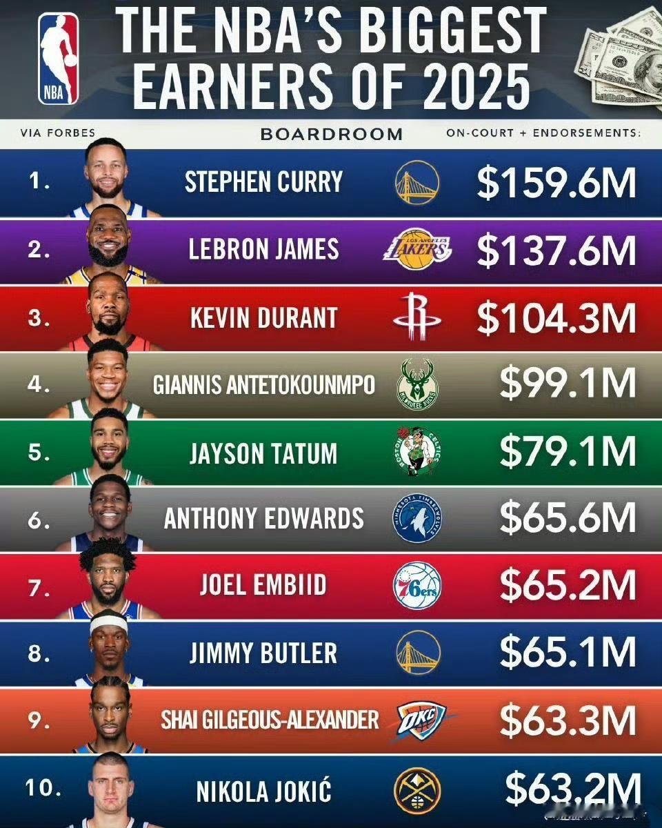 今年NBA的球员收入榜,詹杜库还是最高。 库里1.59亿排第一。 詹姆斯1.37亿排第二。 杜兰特1.04亿排第三。 这是商业+工资收入,2025年还没结束,球星赚多少钱已经能算到。 亚历山大,约基奇基本是工资,商业价值真一般,说明联盟热捧的球星最有钱。[大金牙]