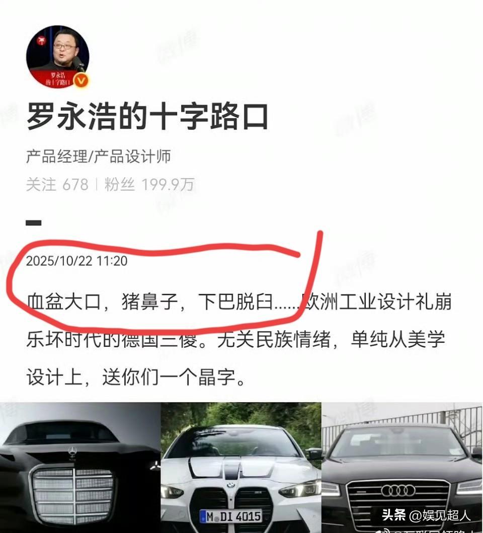 罗永浩又炸锅了!这是真敢说还是另有深意? 罗永浩这张嘴又没闲着!刚让西贝栽了跟头,大家还盼着他歇两天,结果直接把炮口对准了BBA! 他上来就给奔驰、宝马、奥迪扣了顶“德国三傻”的帽子! 吐槽设计更是刀刀见血:奔驰的格栅是“血盆大口”,宝马的双肾成了“猪鼻子”,奥迪的前脸像“下巴脱臼”。更狠的是,他说这是“欧洲工业设计礼崩乐坏”,还怼那些夸设计的是“拿钱写稿”。 这事真不是瞎骂,BBA近年确实在“用力过猛”,把经典元素越改越夸张!老罗还暗戳戳提了句,以前BBA顶配才有的配置,现在国产车入门就给,这诚意差太多。 是真看不上设计,还是替国产车说话?你觉得BBA的设计真丑,还是老罗在博眼球?